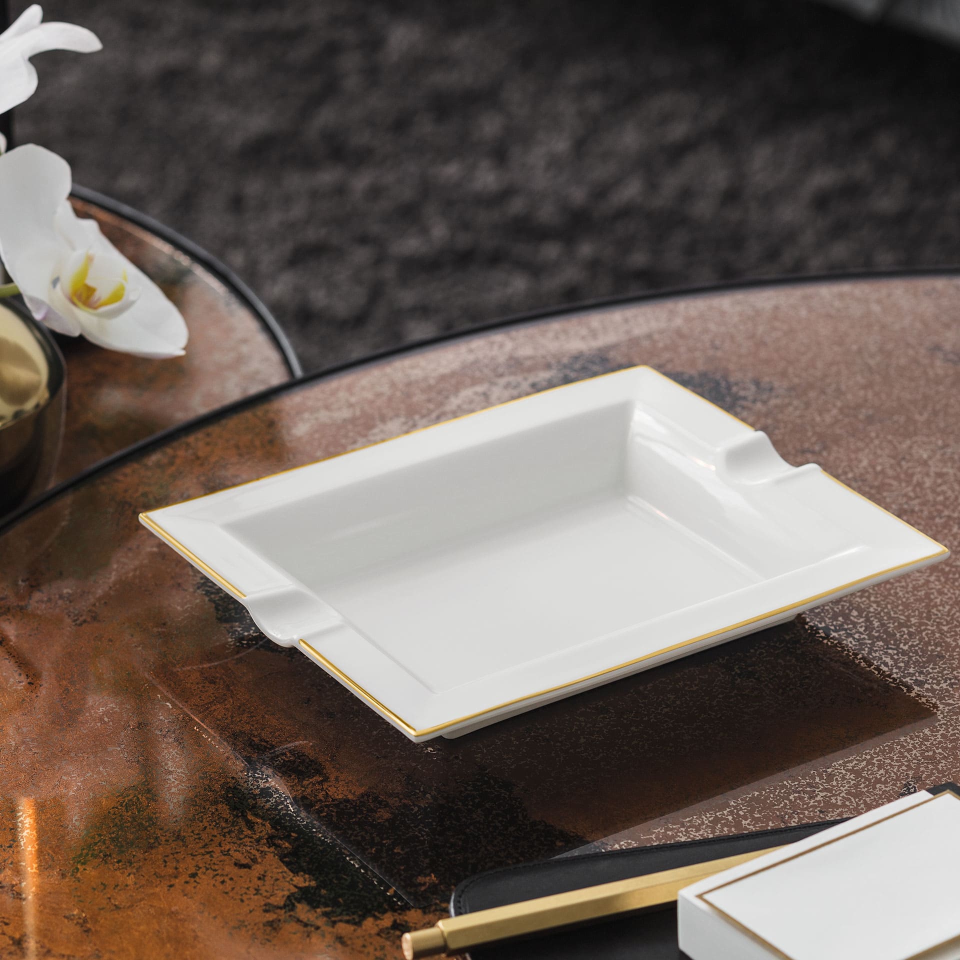 The Anmut Gold collection features hand-painted decorative lines made with fine gold on elegant white, high-quality porcelain. It is precisely this interplay between Premium Bone Porcelain and real gold that gives the collection a sense of style and class. Perfect for anyone who loves both quality and elegance. This ashtray combines functionality with beautiful design and will delight you for a long time with its brilliant pattern thanks to Inglaze Gold technology,. Make your table more beautiful with the timeless charm of fine gold.