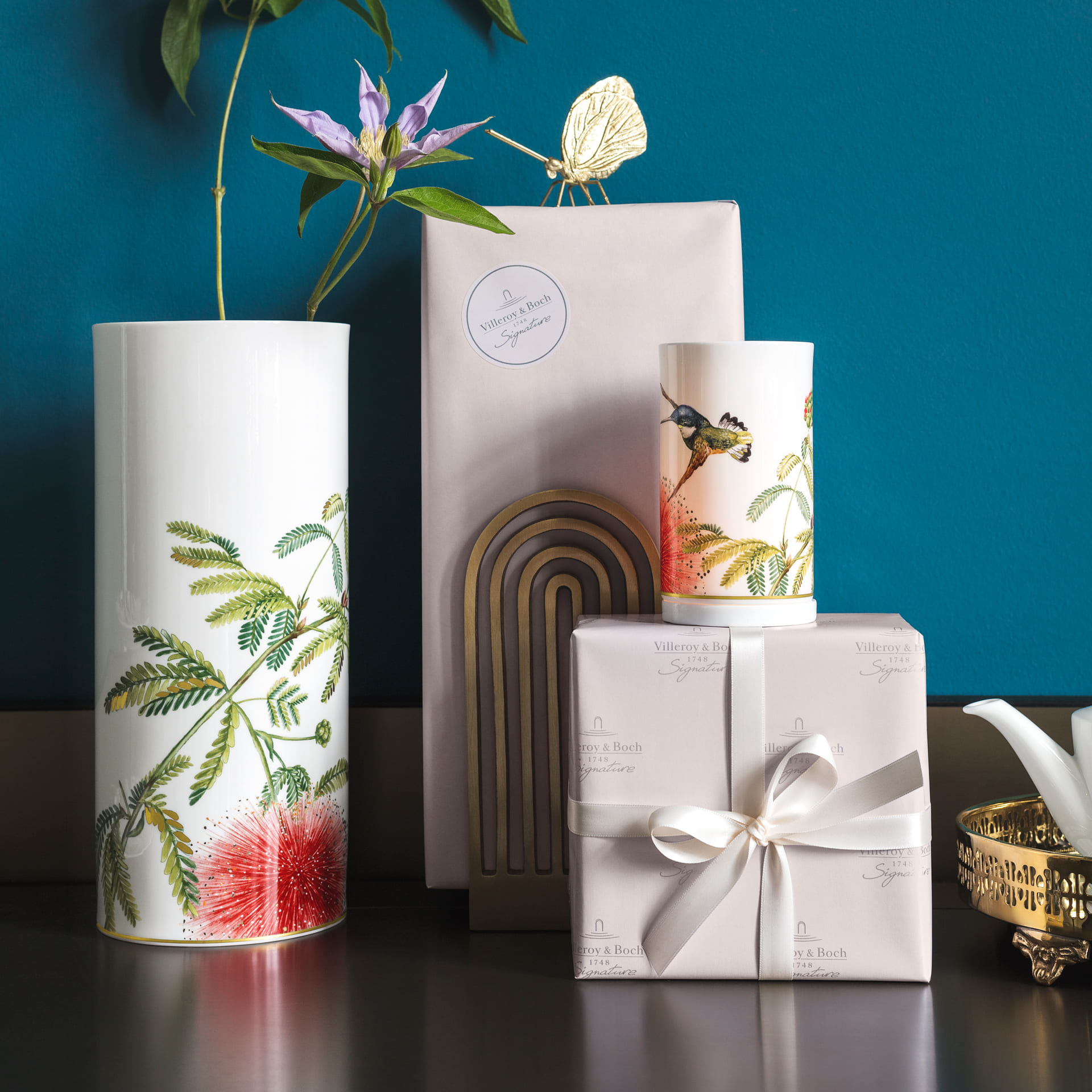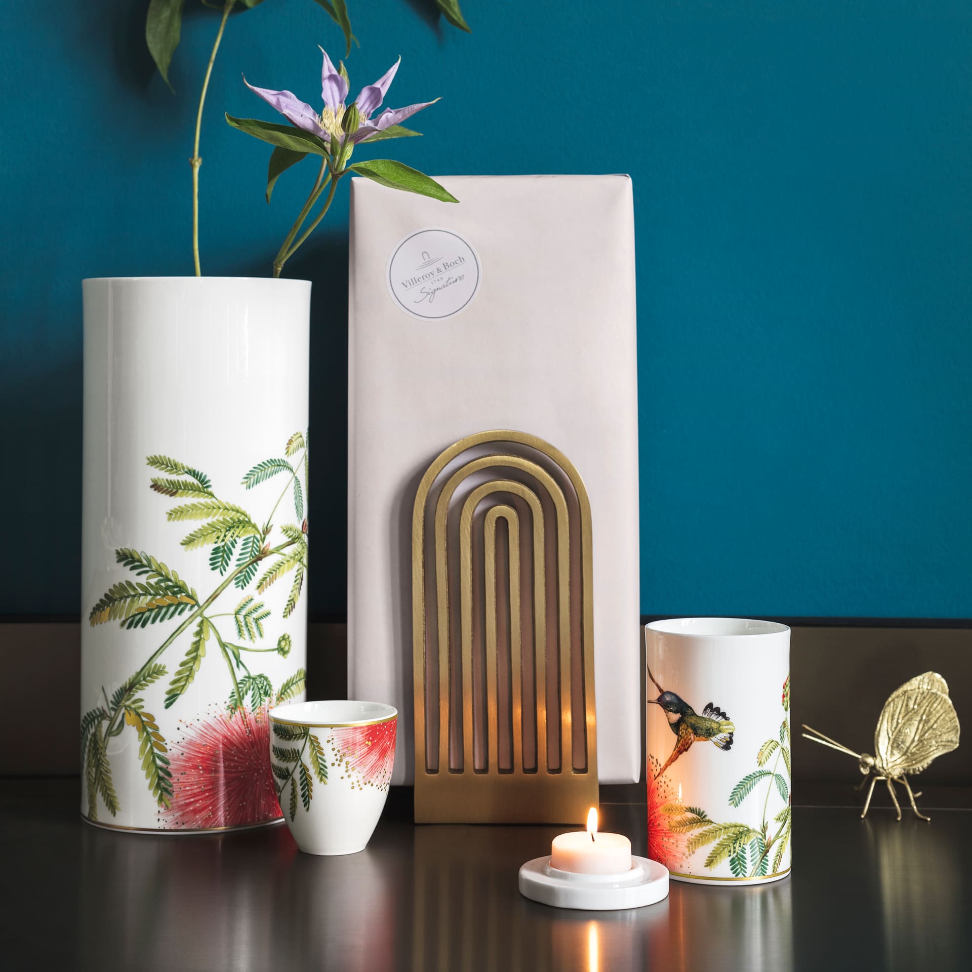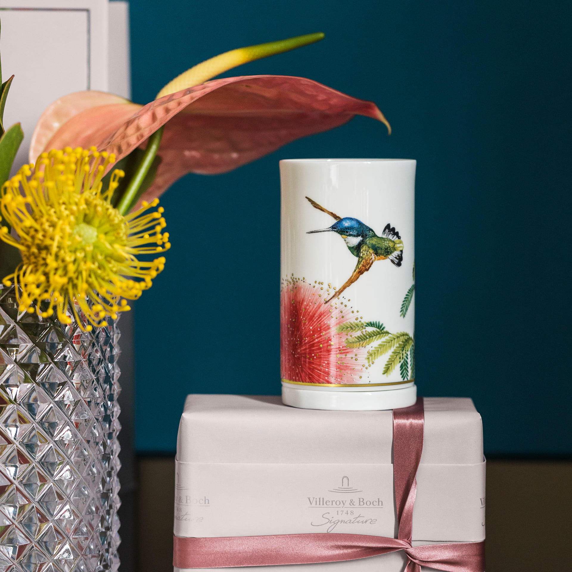 Floral splendour by candlelight. Magnificent orchids, enchanting hummingbirds and colourful butterflies straight from a tropical rainforest – the Amazonia crockery and gifts collection lets you follow in the footsteps of the naturalist Alexander von Humboldt. Each element is an exclusive eye-catcher made from fine Premium Bone Porcelain that takes you on a voyage of discovery to the true beauty of nature. This tall tea light holder creates a pleasant subdued light while bringing the Home decor to life. Go on your own style expedition with a floral Home decor.