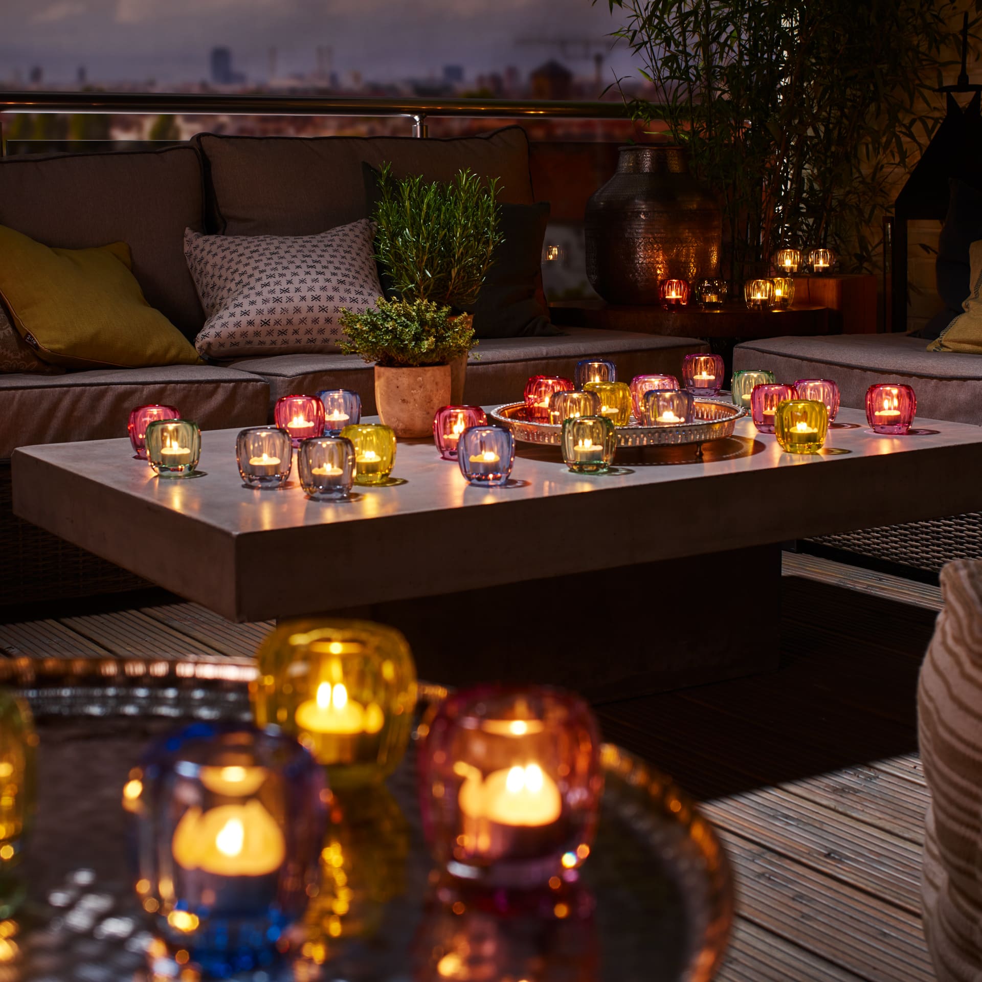 Coloured DeLight hurricane lamp Berry Fantas. Radiant light effects for your home. Stylish tealight holders, tealights and vases in the latest on-trend colours will instantly conjure up atmospheric effects in your home. The striking faceted finish of the small high-quality crystal glass Accessories creates exceptional light effects during a cosy candlelit evening. Larger versions can also be used as decorative vases – ideal for displaying your favourite flowers.
