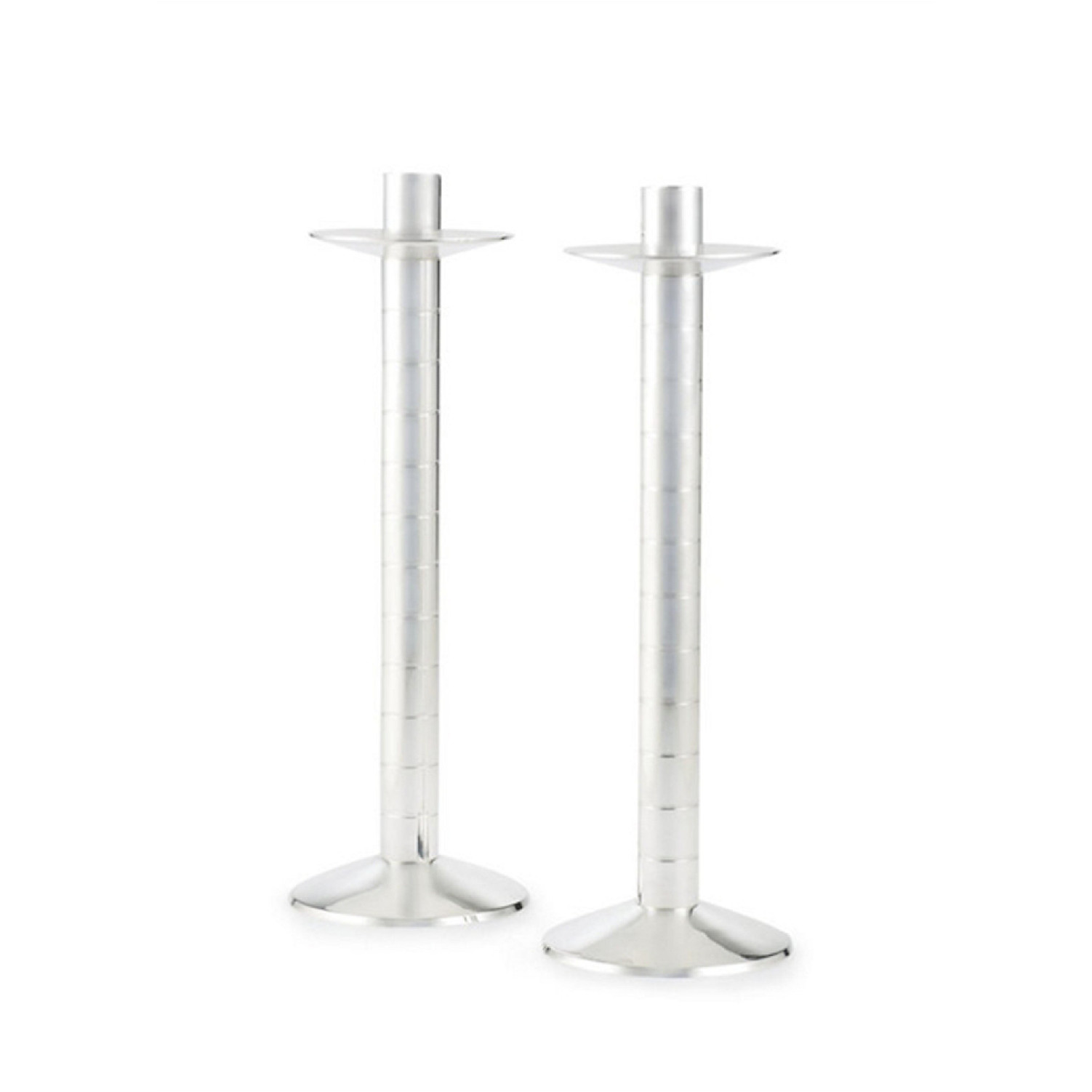 Crafted from polished silver-plated brass the Montgomery Candlestick Pair is designed with sleek Art Deco-inspired grooves.