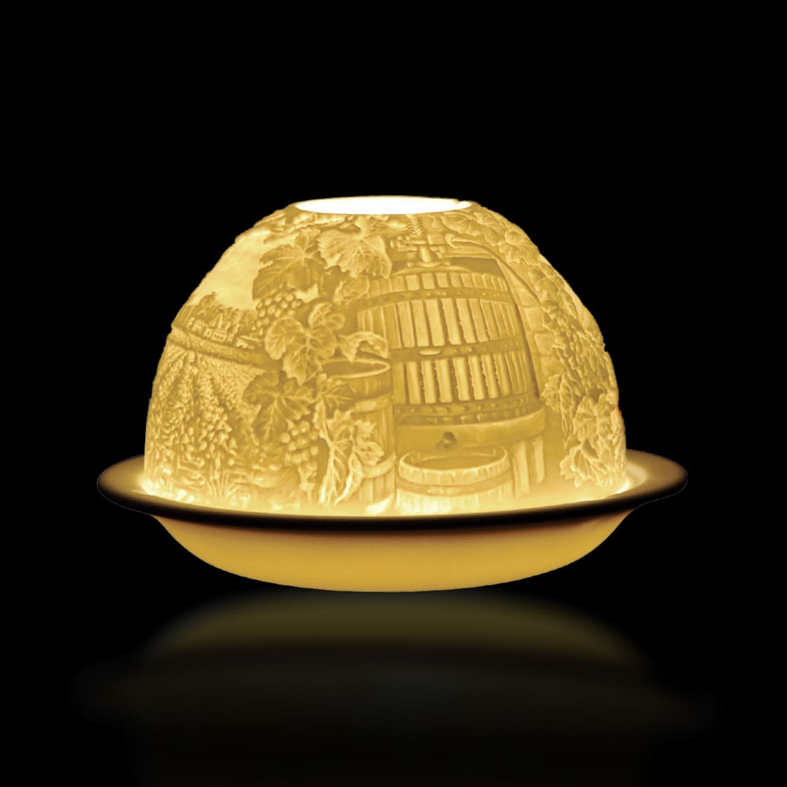 Votiveligh Grape harvest from Litophanes collection. The Lithophane VotivelightTM is a traditional engraving technique on a fine bisque non-glazed porcelain that was invented in Limoges in 1828. Bernardaud still use it to craft beautiful votives that come in a wide variety of decor. The glow of the candle shines through the raised and carved surface of the votive, contrasting light against shadow and thus revealing its richly detailed design.