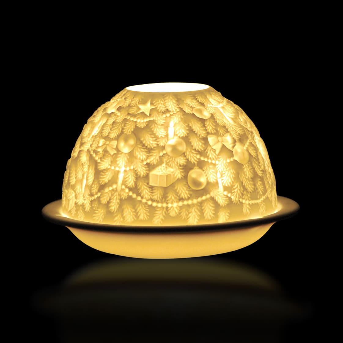 Votivelight Christmas tree from Litophanes collection. The Lithophane VotivelightTM is a traditional engraving technique on a fine bisque non-glazed porcelain that was invented in Limoges in 1828. Bernardaud still use it to craft beautiful votives that come in a wide variety of decor. The glow of the candle shines through the raised and carved surface of the votive, contrasting light against shadow and thus revealing its richly detailed design.