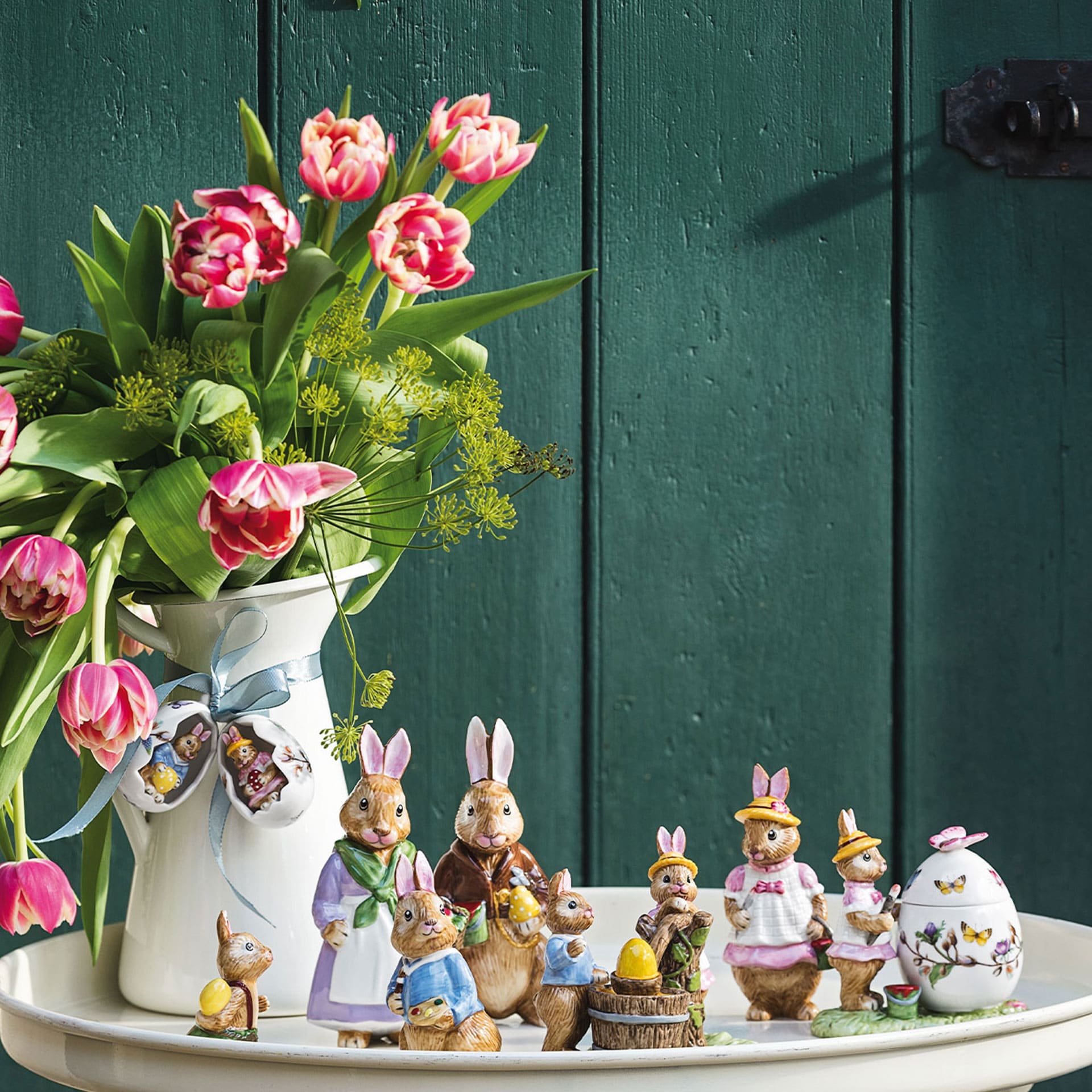 Let the Bunny Tales figurines tell the story of Bunny Grandpa Hans who teaches his grandchildren Anna, Max and baby Paul how to paint eggs. The hand-painted Paul bunny figurine makes the perfect charming Easter decoration on your table or between spring flower arrangements. Experience the magic of Easter.