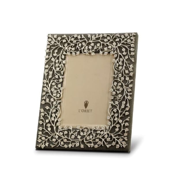 Emulating centuries of fine jewelry design and technique, this intricately detailed picture frame is handcrafted with 24K gold and platinum plating, beveled glass, satin lining and Italian leather and suede backs with beautifully detailed closures.