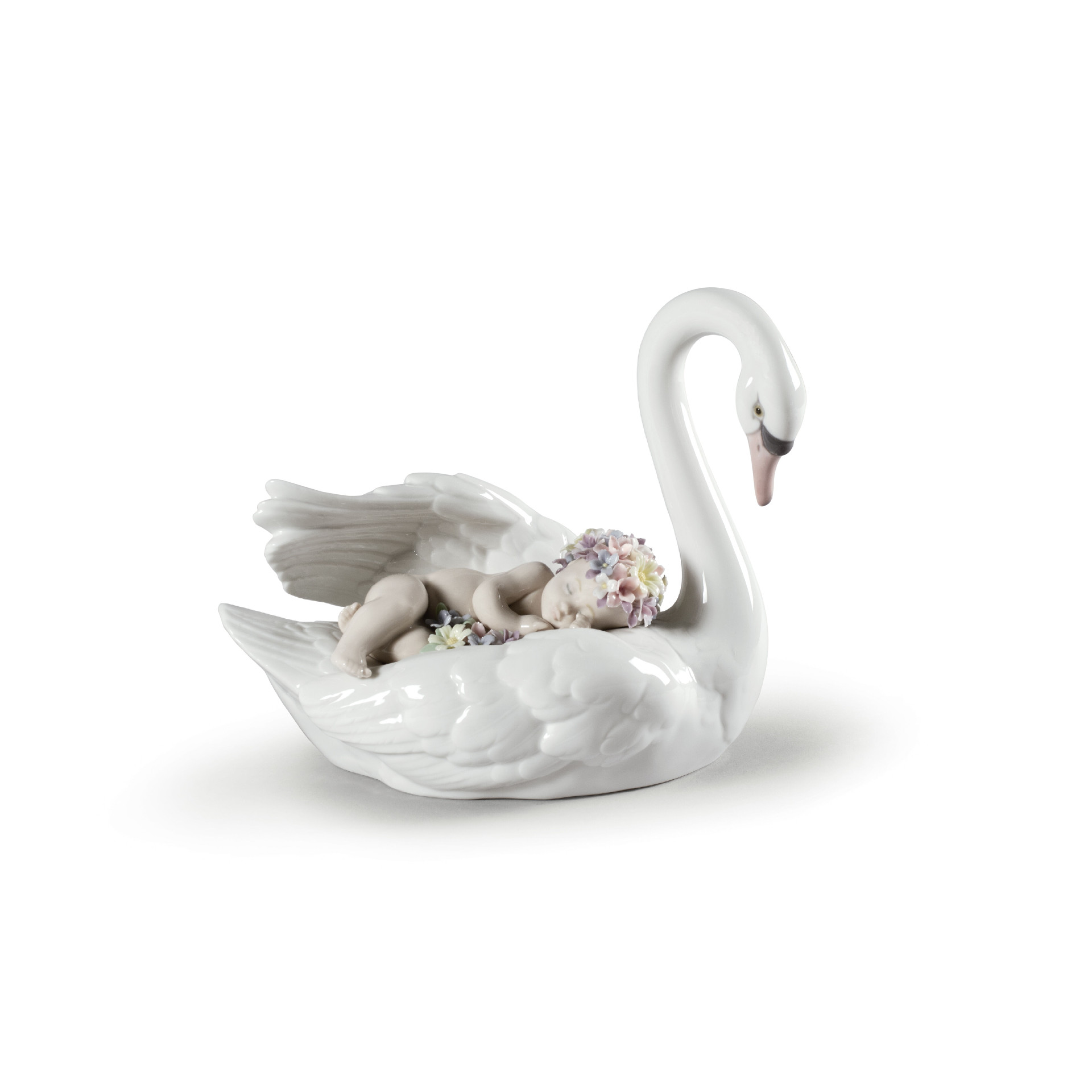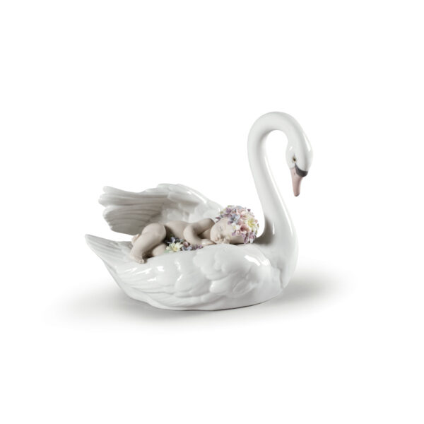 In his dreams, a beautiful swan carries him over a placid lake and perfumed flowers cover his hair. This beautiful fantasy is brought to life in delicate glossy porcelain, decorated in soft pastel colours, in this piece that is perfect as a gift, collectors item or decoration.