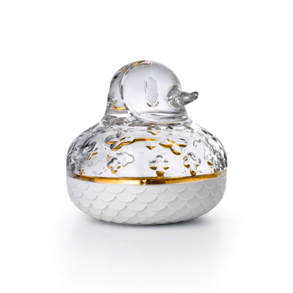 Duck clear by Jaime Hayon Limited edition. As a follow-up to his cheery Crystal Candy Set and Candy Light creations, Jaime Hayon has designed a collection of animal figurines for Baccarat inspired by Artoyz. His three colorful creatures a bear, a monkey, and a duck are available in luminous Clear crystal or vivid-hued versions. The water bird is presented in a playful way. The cartoonishly plump round silhouette is adorned with scalloped duck feathers, and the crystal head is speckled with small diamond cuts around the face and beak. The Clear crystal version of the duck has a white porcelain base with a gold finish the mint version has a mint porcelain base with a Clear crystal face. The figurines are individually numbered and signed by Jaime Hayon and Baccarat on the underside of the porcelain base.