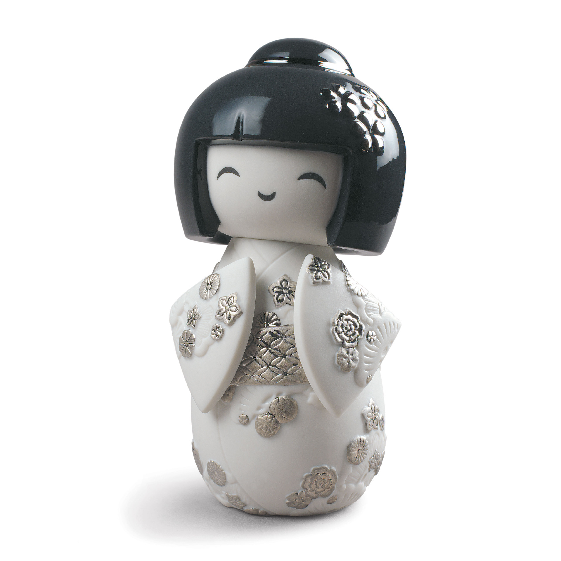Inspired by Kokeshi or traditional Japanese wooden dolls, this piece represents an updated vision of millennial heritage. Finished in matte white porcelain, the decoration of this charming piece brings out an attractive contrast, thanks to the platinum lustre enhancing the floral motifs of its dresses and accessories.