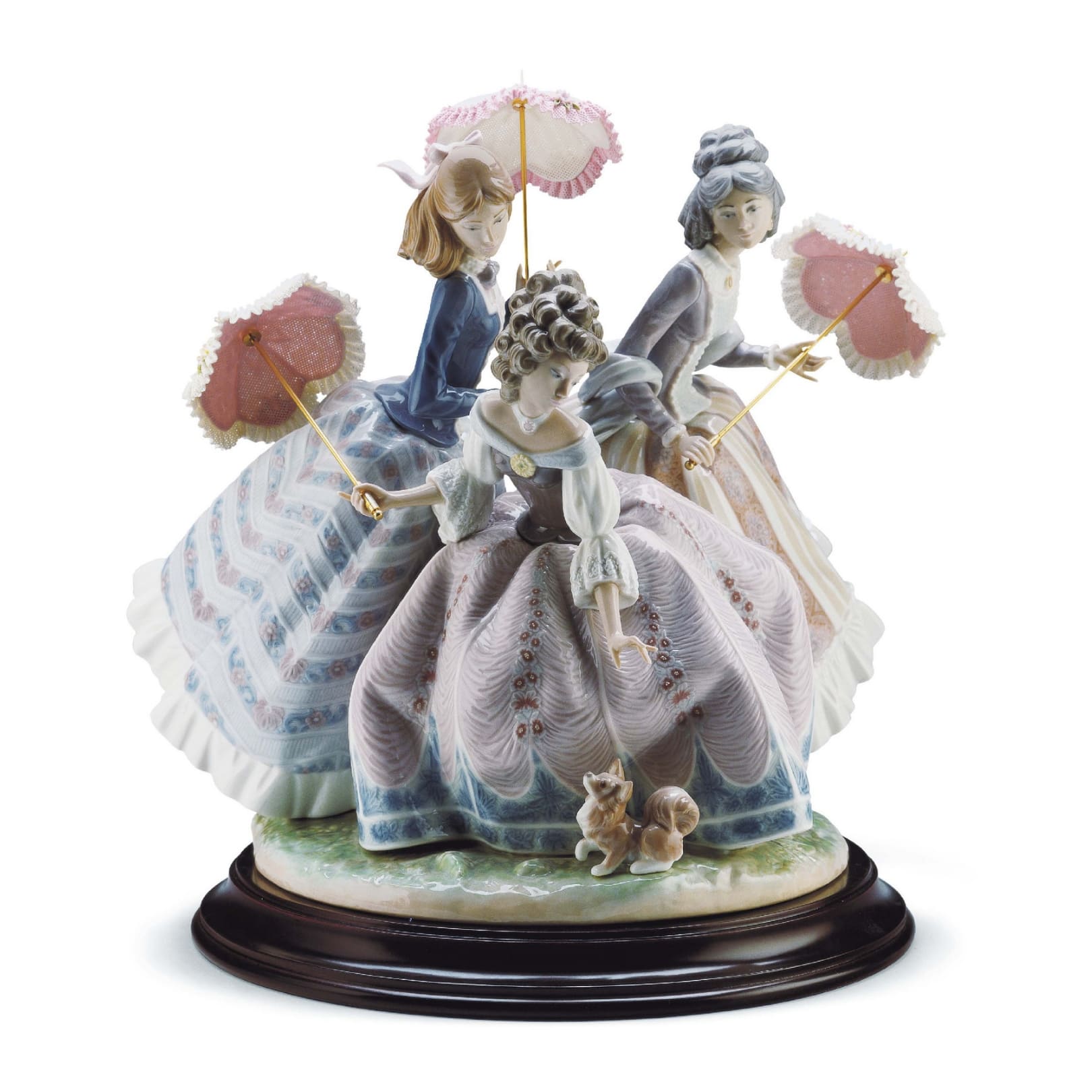 Limited series porcelain glossy sculpture of three Rococo ladies with umbrellas made of lace and tulle with funny little doggie that catches their attention.