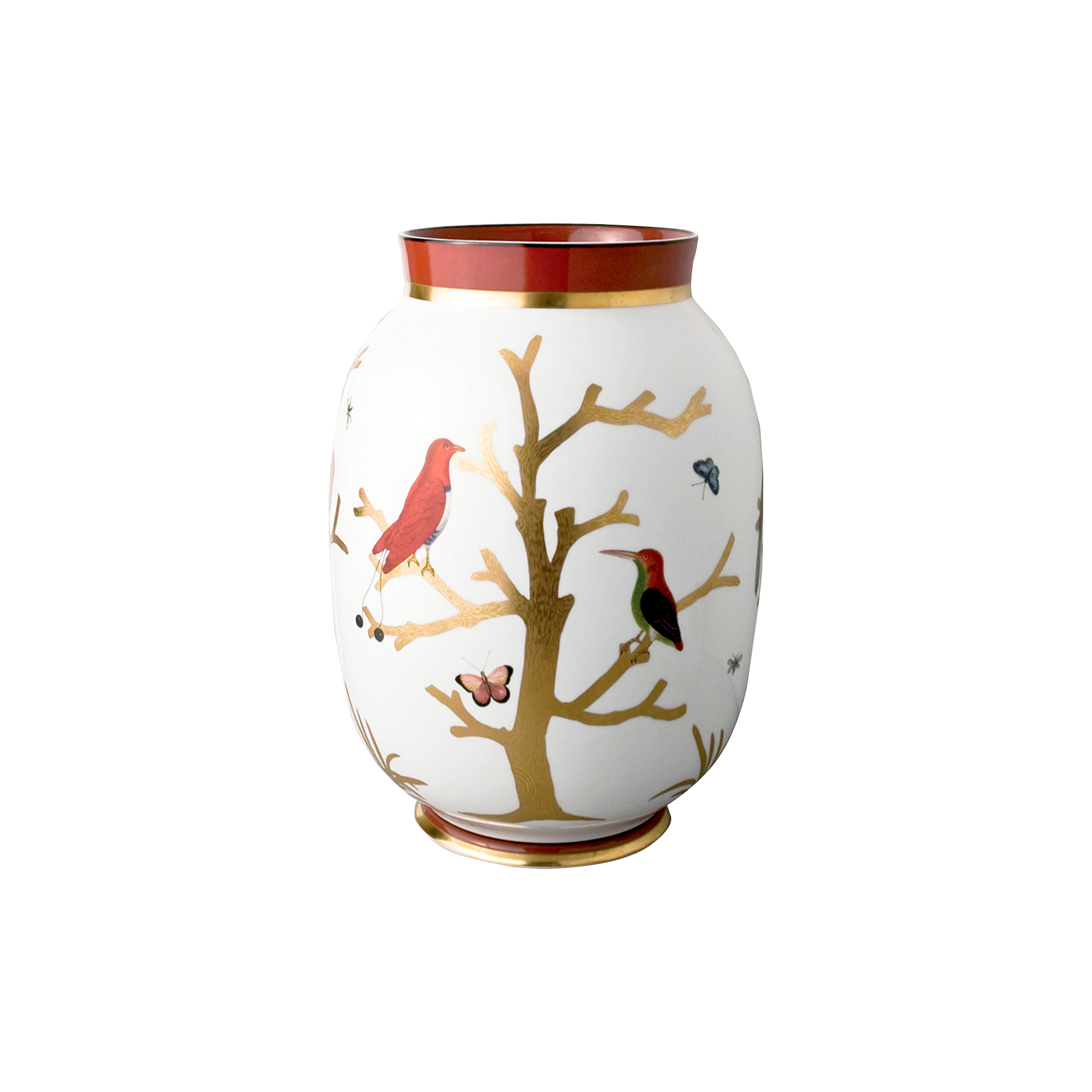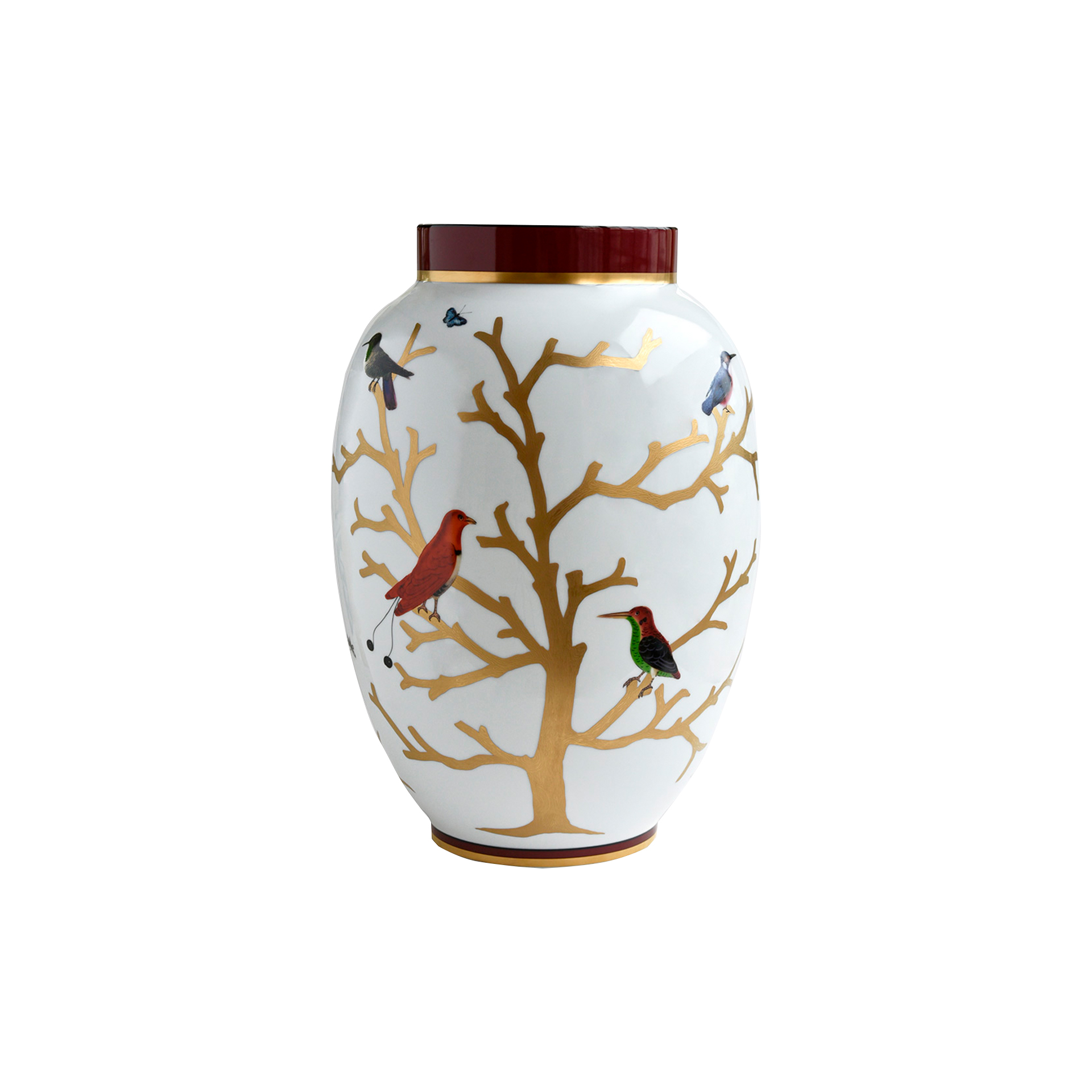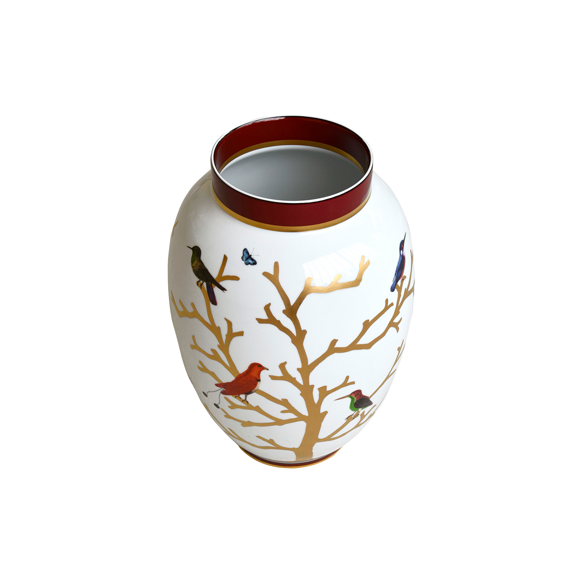 Toscan vase from Aux Oiseaux collection. Inspired by the curiosity cabinets that were so fashionable in the 16th and 17th centuries, the pattern is available on a full dinnerware service with scenes reminiscent of japanese prints: birds depicted in automnal colors perch on stylised trees in raised gold.