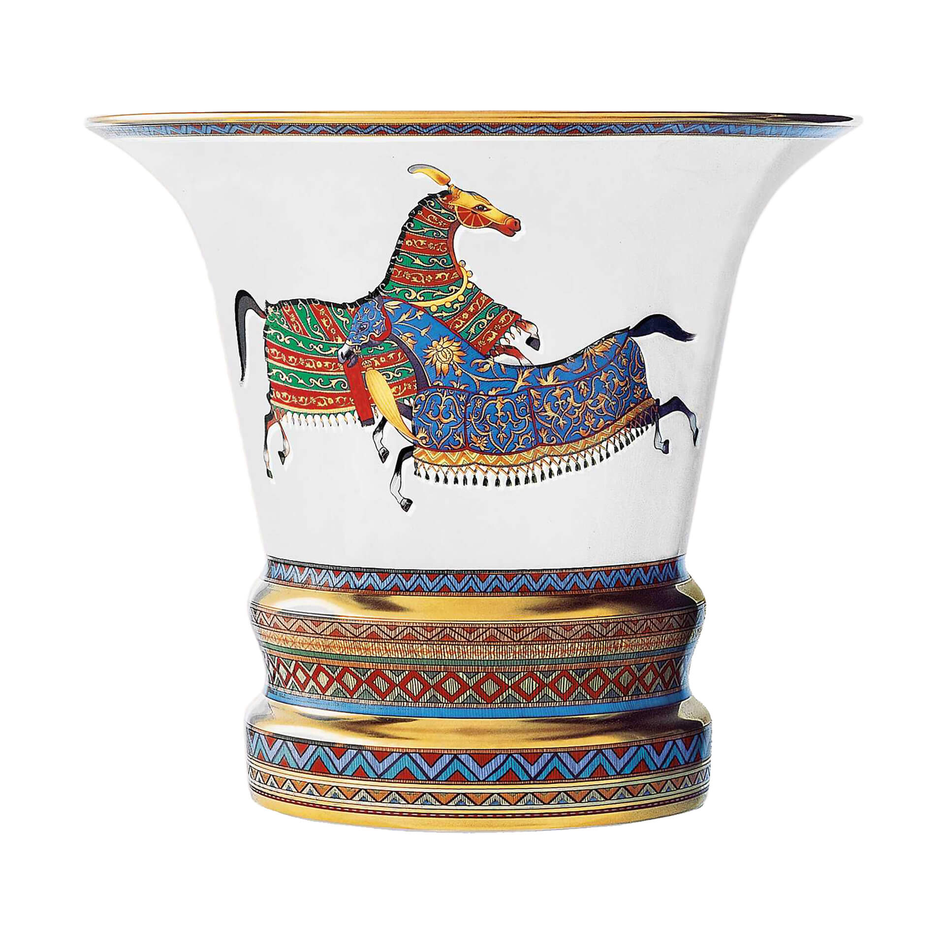 Vase from Cheval d’Orient collection. Joyful horses enjoy their freedom, galloping across the steppe and climbing wooded hills. Resplendent in their gleaming, brightly coloured caparisons, they seem to have only just escaped from a Persian legend. The accompanying floral and multicolour stripe patterns dotted with gold evoke the Silk Road and Eastern hospitality.