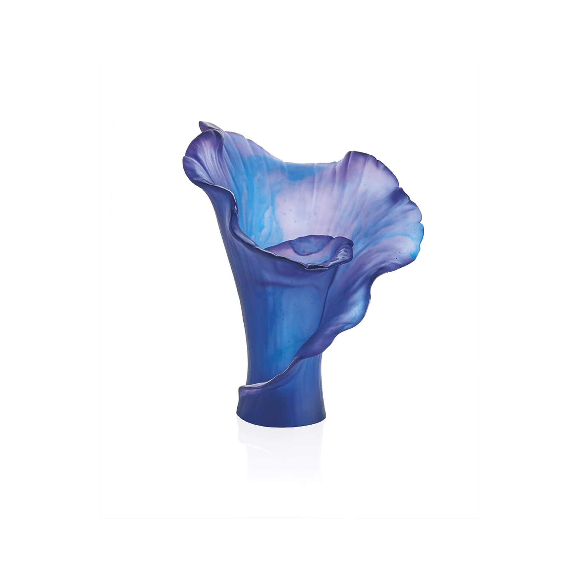 Medium Arum Bleu Nuit vase Numbered edition. Subtle and elegant, the Arum collection imposes its style in the new floral collection of the Maison Daum. A Mediterranean flower in the family of Araceae, the crystal manufacturer creates a magical species where the material blends with the curves of the flowers. In the form of vases, bowls, decorative flowers or perfume bottles, Arum invites us to appreciate floral art, a world where colours, scents and nature come together to create a paradise. A poetry that is written one season a year is the reason why Daum desires to make it eternal. In this collection, the crystal plays with shades of blue, with the flowing forms of the generous corollas and the miniature flowers of the perfume bottles.