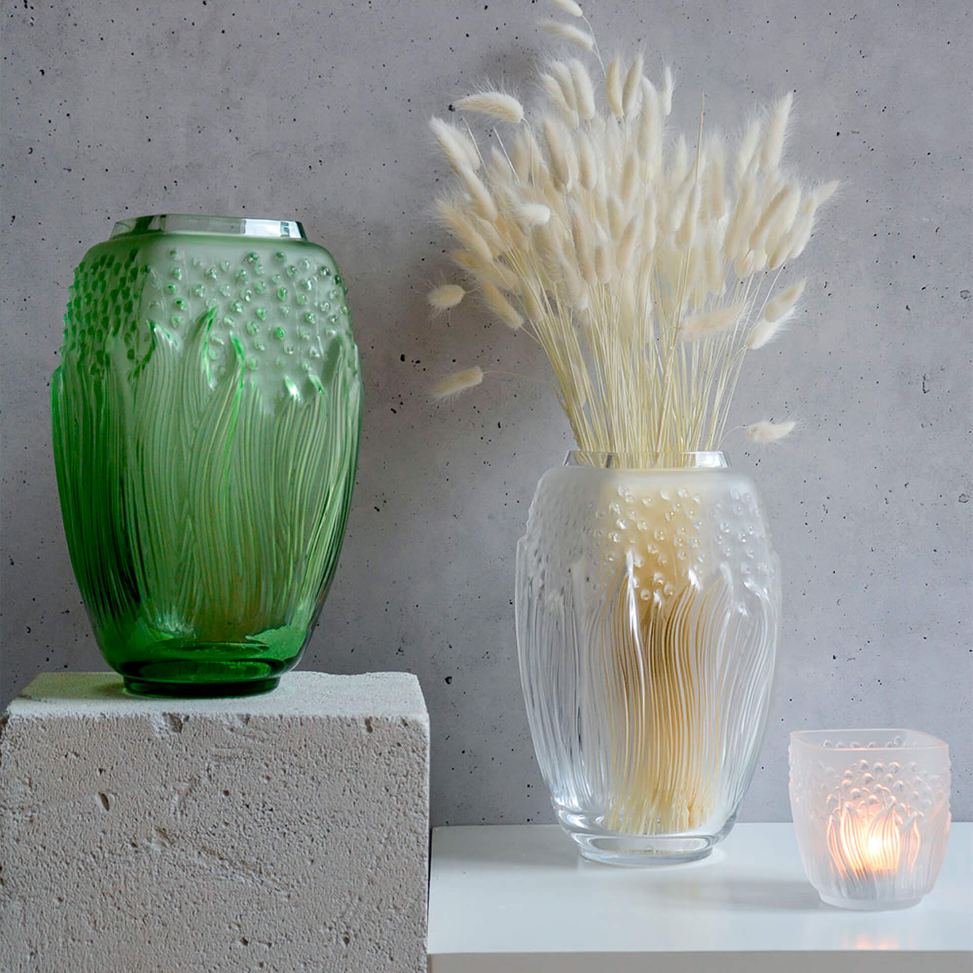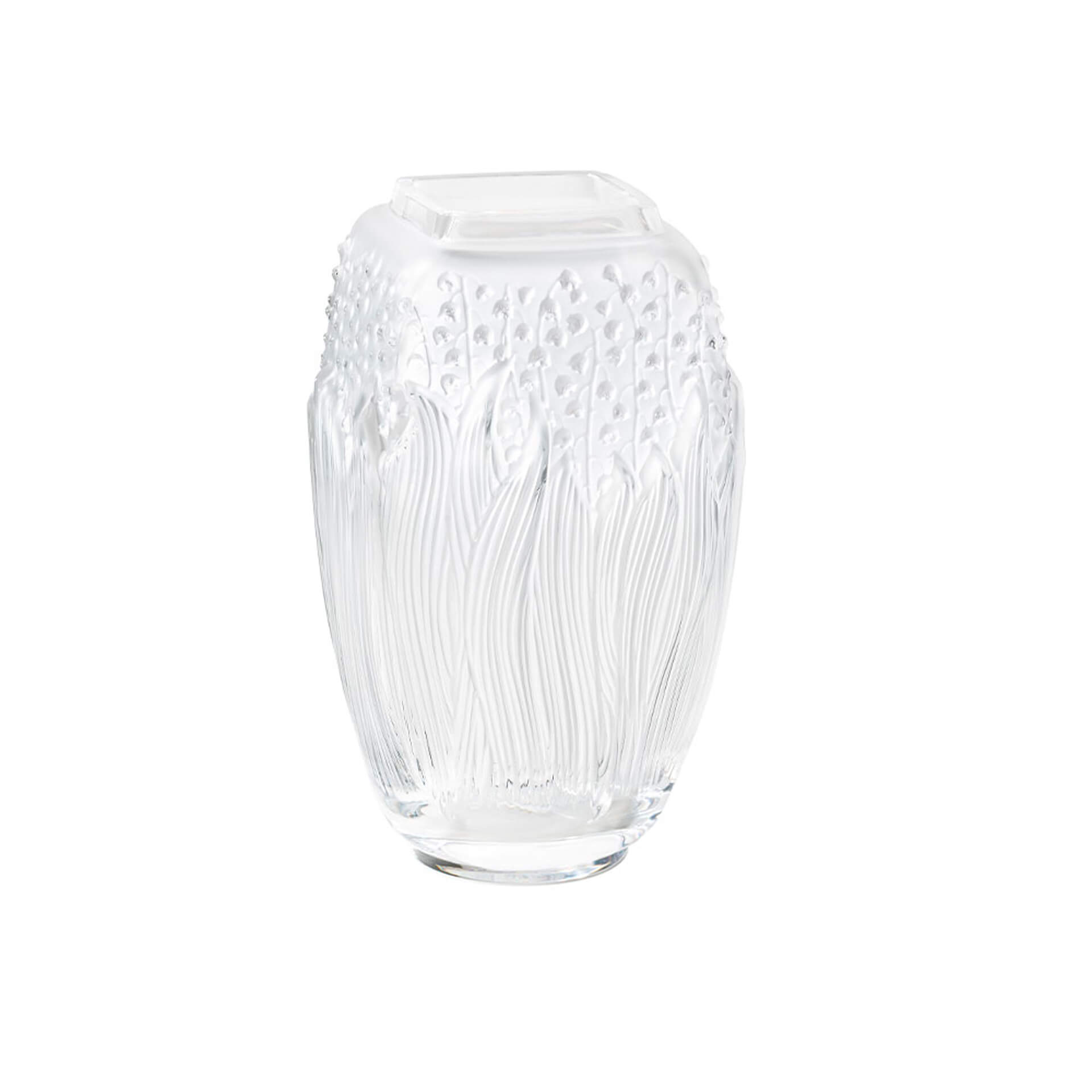 A symbol of good luck and René Lalique’s favourite flower, lily of the valley plays on accumulation on this vase. The light and delicate bells are revealed behind the long undulating leaves, as if rocked by the wind. The square shape contrasts with the curved lines of the motifs illuminated by satin-finished crystal.