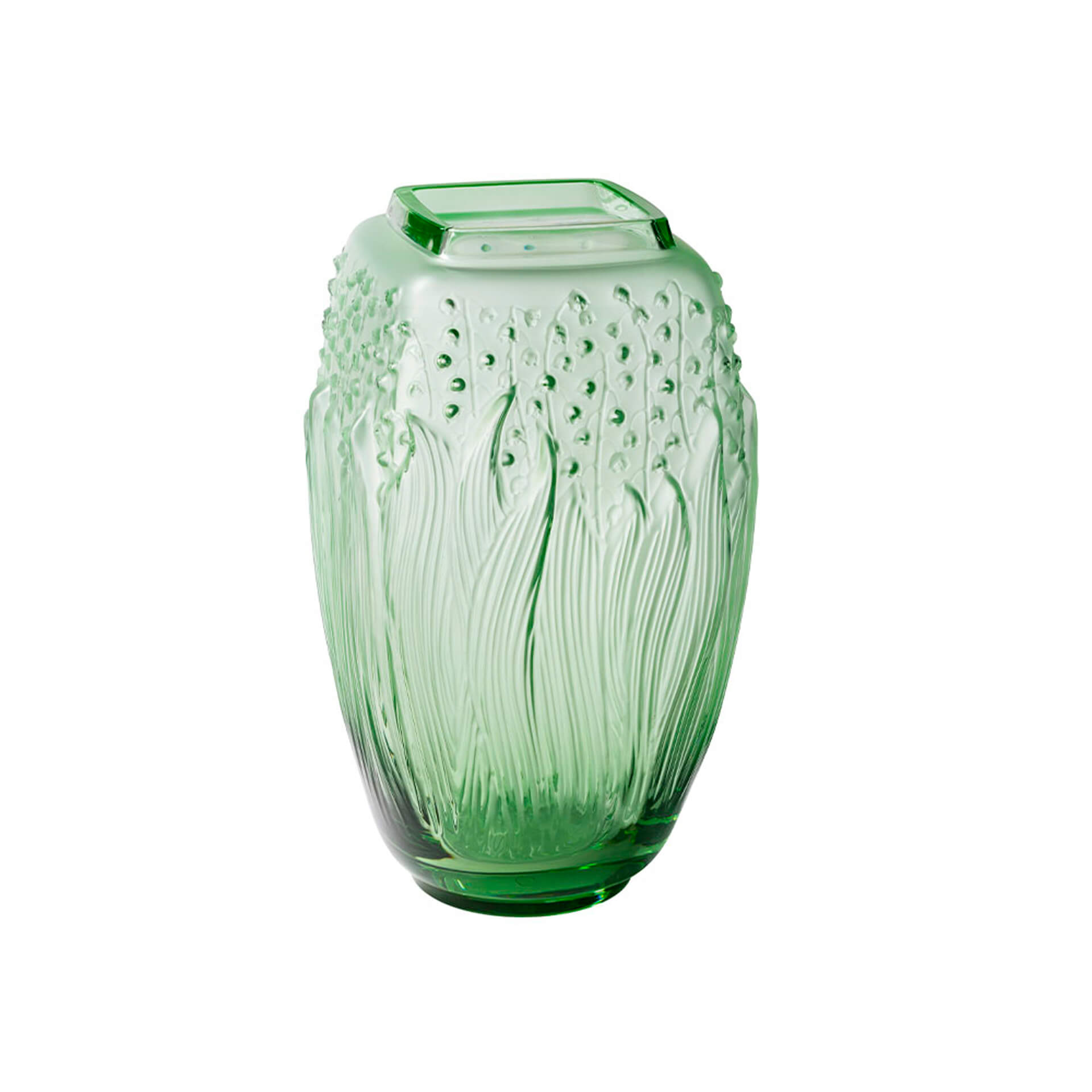 A symbol of good luck and René Lalique’s favourite flower, lily of the valley plays on accumulation on this vase. The light and delicate bells are revealed behind the long undulating leaves, as if rocked by the wind. The square shape contrasts with the curved lines of the motifs illuminated by satin-finished crystal.