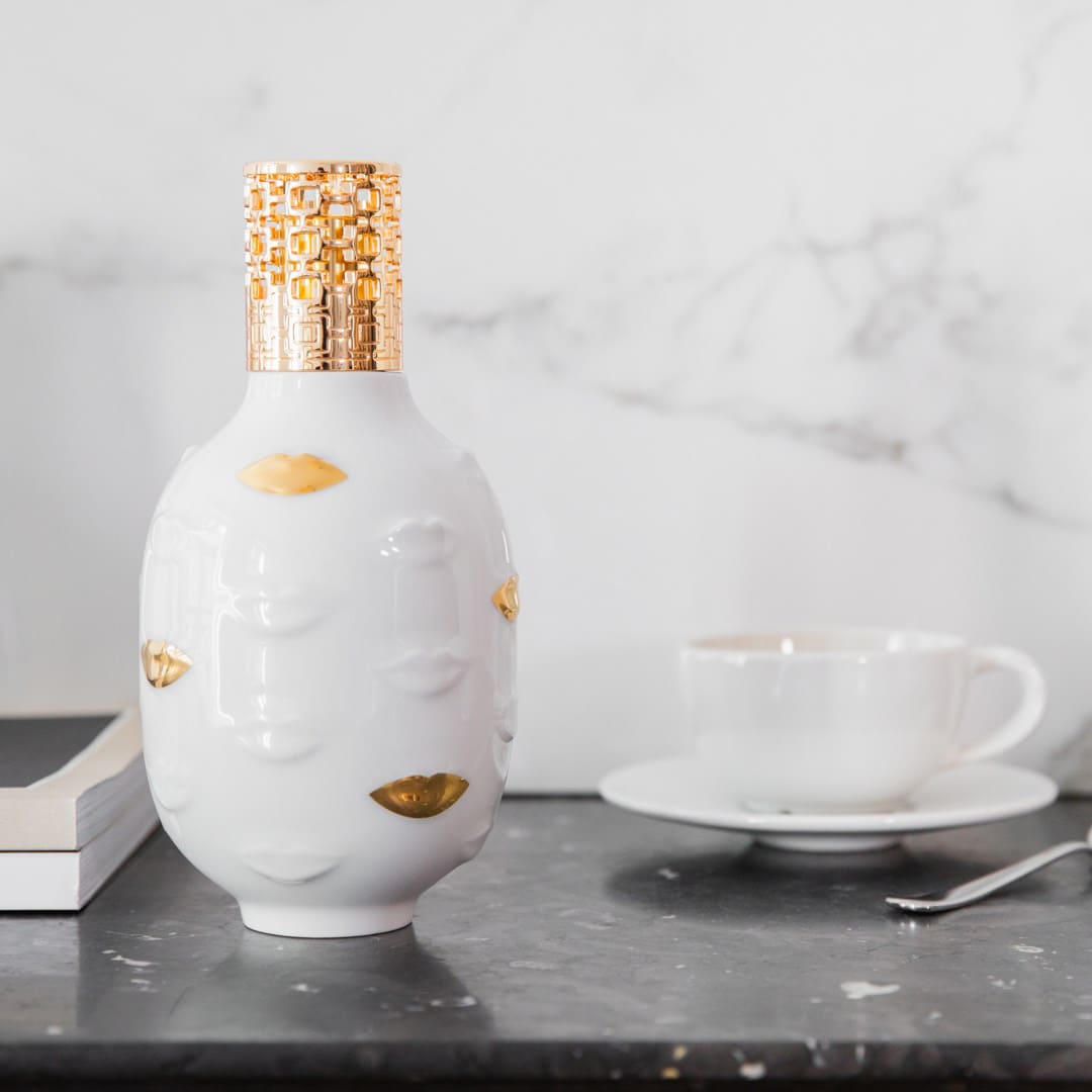 A delicate Lampe Berger in porcelain with sculptural and surrealist gilded patterns by Jonathan Adler. A unique, designer piece that gives a kiss of cool to your interior.