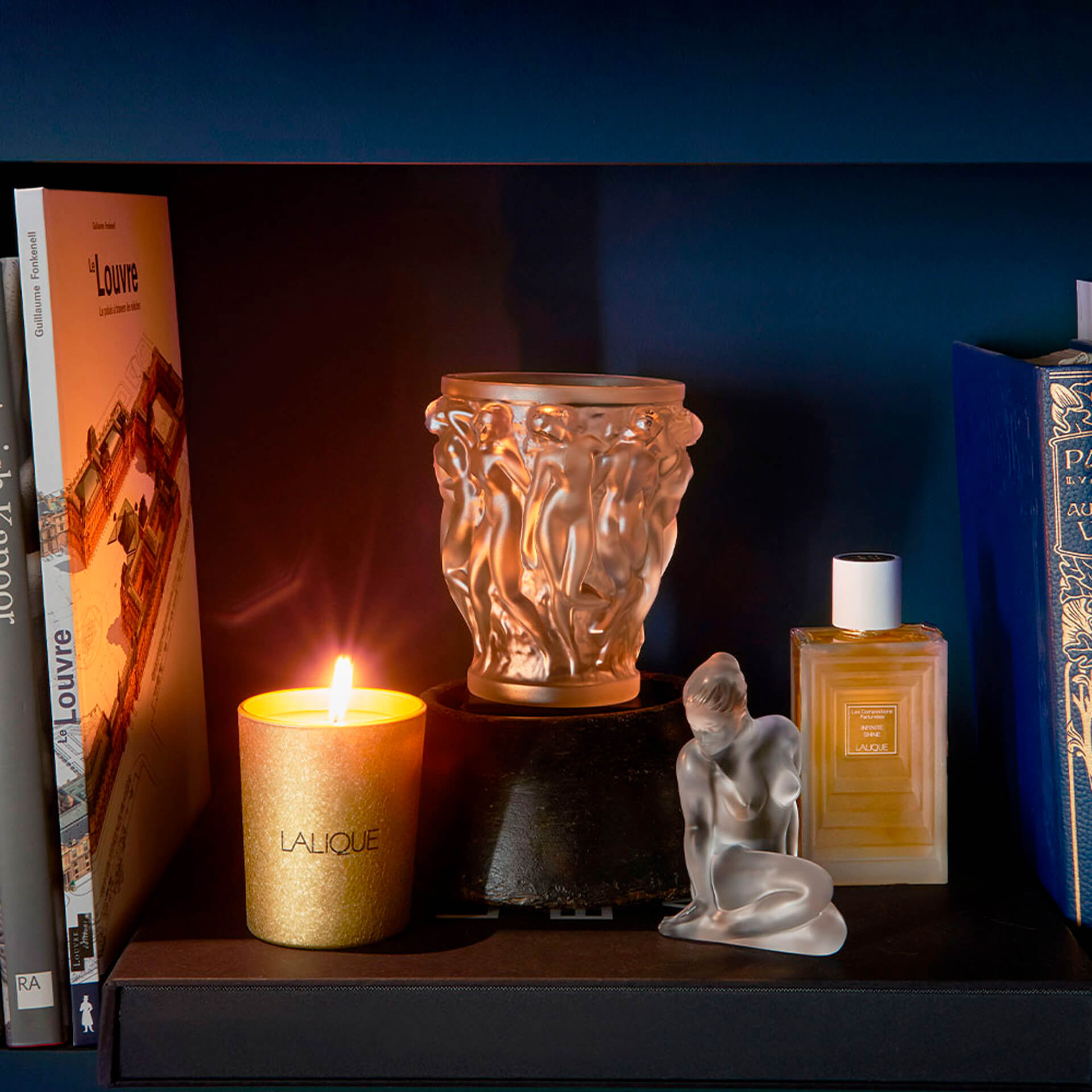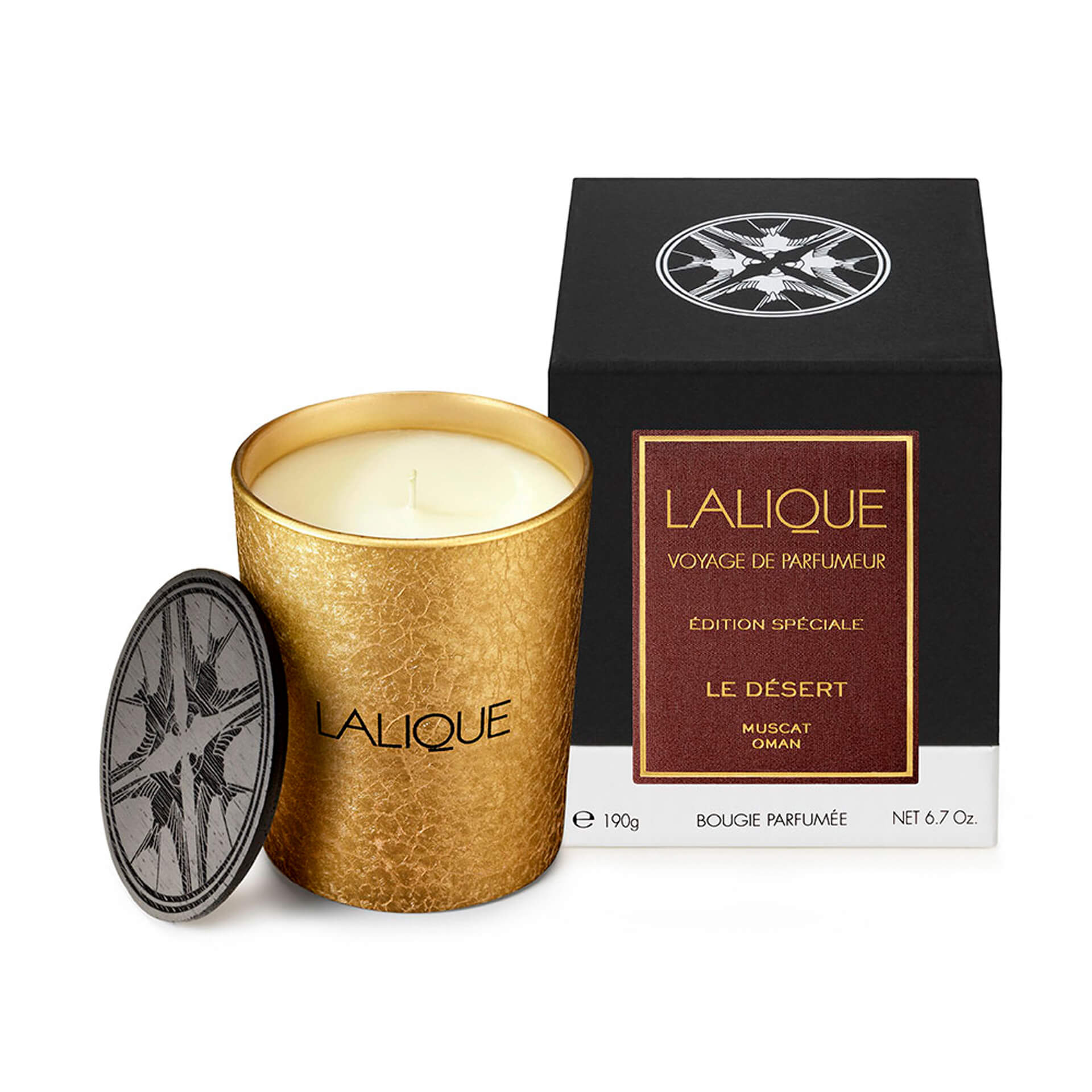 Jewel of the East, the desert of Oman has been home to legends and history since the dawn of time. Lalique pays tribute to the magic of this place by creating a candle, each one adorned with a Unique pattern of golden volutes evocative of sand dunes finely sculpted by the wind. The fragrance of a thousand and one riches evokes a journey through the immensity of a desert. The fragrance opens with spices and roses, enhanced with incense, honey, orange blossom and oud.
