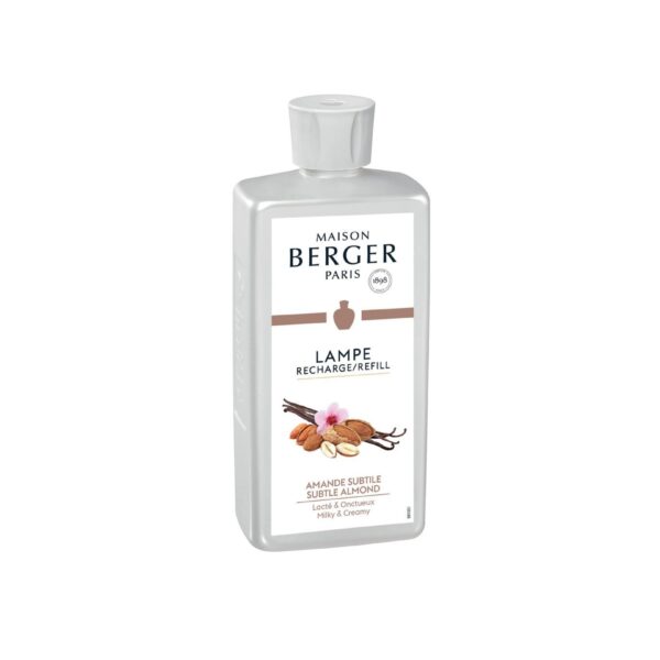 Subtle Almond lamp fragrance 500 ml. A unique fragrance obtained through a judicious blend of aniseed, green and almond notes, combined in its heart with a delicious floral bouquet, and sustained by its suave and oriental sandalwood bottom notes. An elegant, milky and smooth home fragrance.