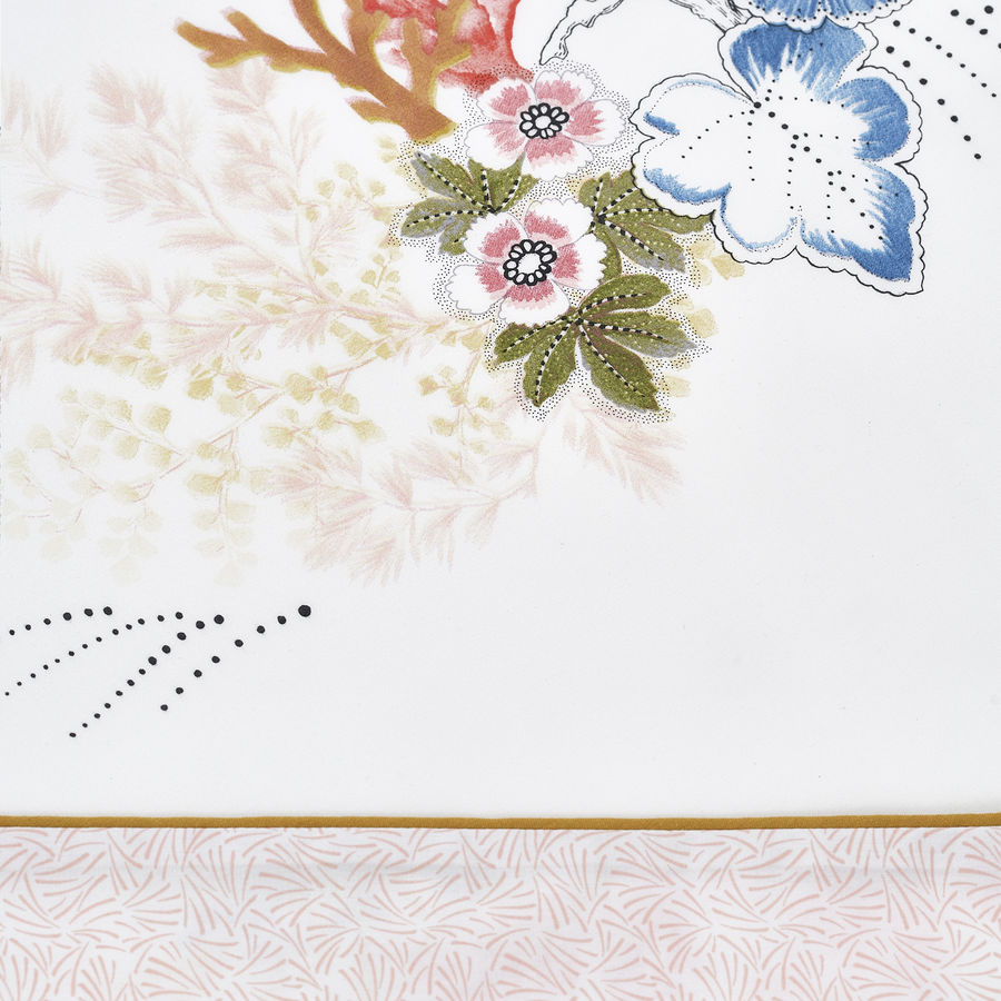 Bed linens printed on 100 long staple combed, cotton percale, 200 thread count. Reversible design : 15 colours main design, 1 coordinated design. Piped finish.