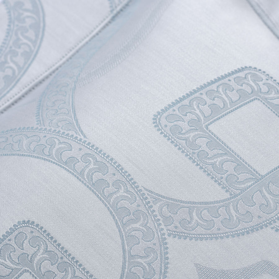 Damask bed linens, 100 long staple combed, cotton sateen, 500 thread count. Saddle stitch finish.