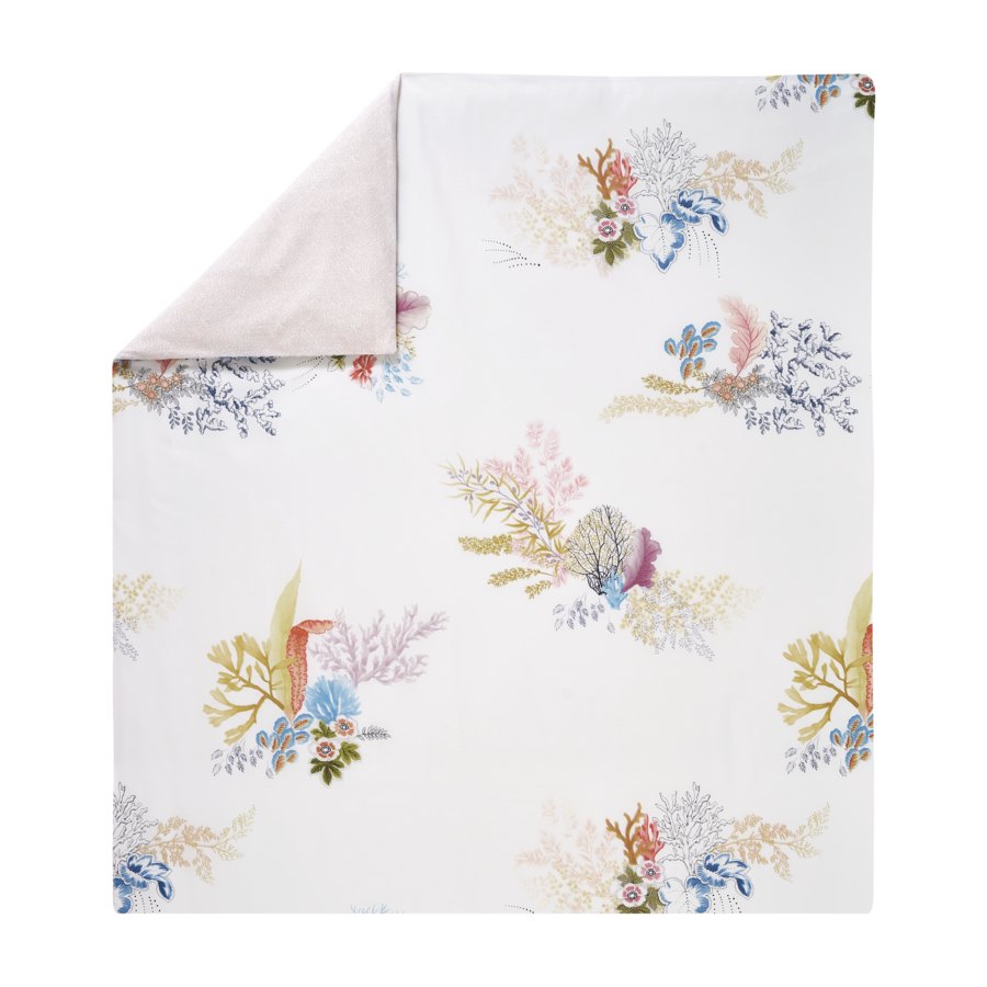 Bed linens printed on 100 long staple combed, cotton percale, 200 thread count. Reversible design : 15 colours main design, 1 coordinated design. Piped finish. Double face duvet cover with flap and button enclosure.