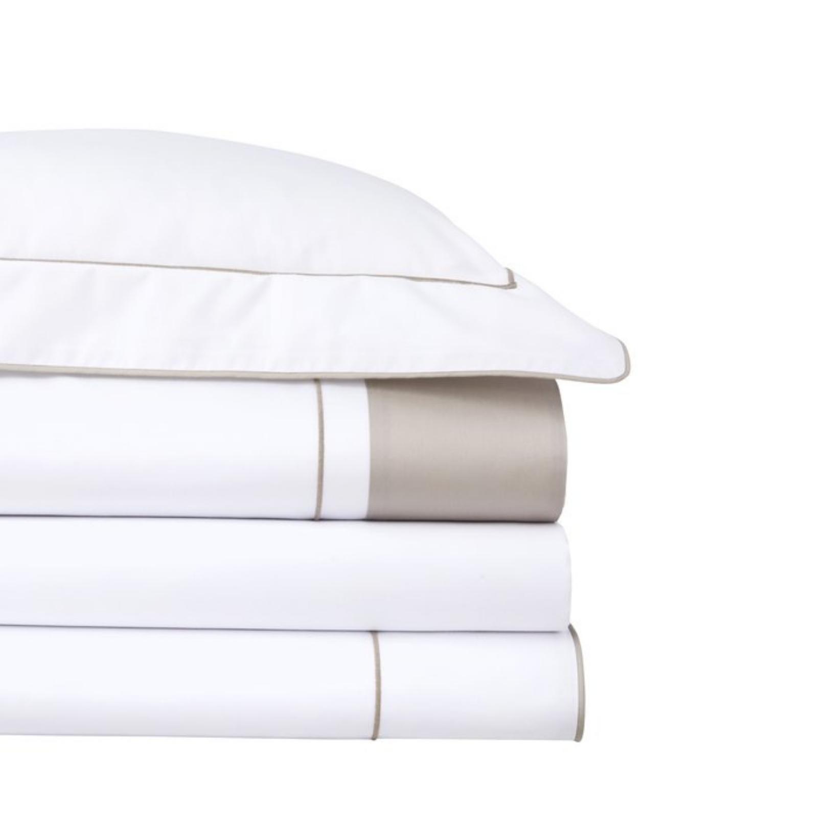 White 100 long staple combed organic cotton percale, 200 thread count. 4 border with contrasting bourdon stitch and piped finish. fitted sheets are deep 18 pocket depth and fit most mattresses. Contrasting bourdon stitch embroidery. duvet cover with flap, button closure for USA. Purity of white percale underlined by a colored piping and an assorted trim. A classic design with a contemporary simplicity.