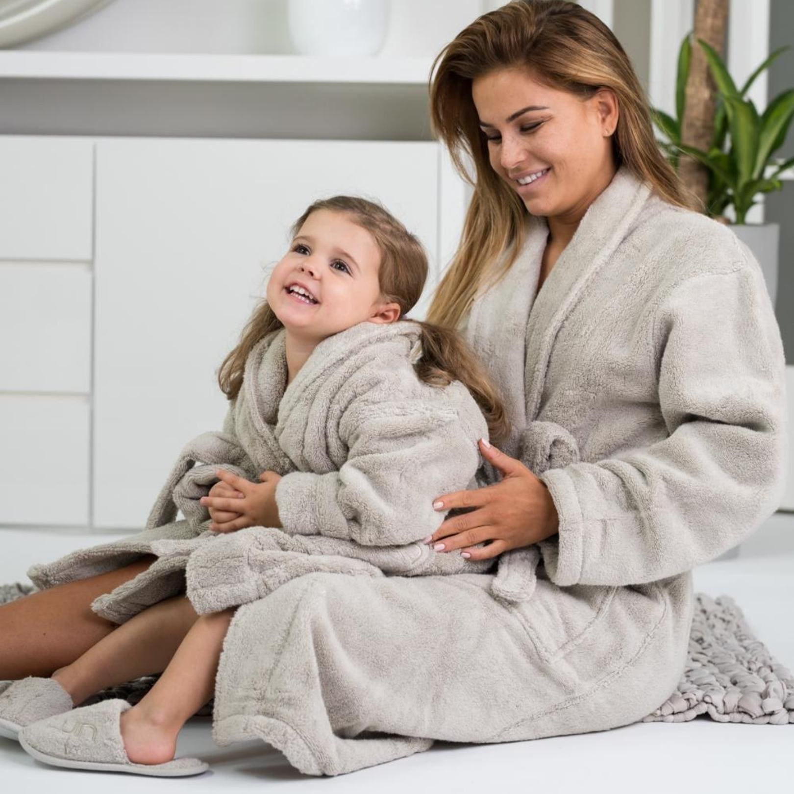 Bathrobe for children is made with exactly the same design as the adult version. The belt is attached from the back and the child can hide all the secret small belongings into the big pockets. The bathrobes are part of the beloved Your Home – Your Spa bathing collection, which is made of our super soft, fluffy and water-absorbent signature cotton towel material. First class Oeko-Tex certificate guarantees no harmful substances are used in the production. The bathrobes reflect our modern harmonious colour world, ending up the era of frogs and princesses in children’s bathing textiles. It is the quality and well-being of the material against the child’s skin that matters the most.