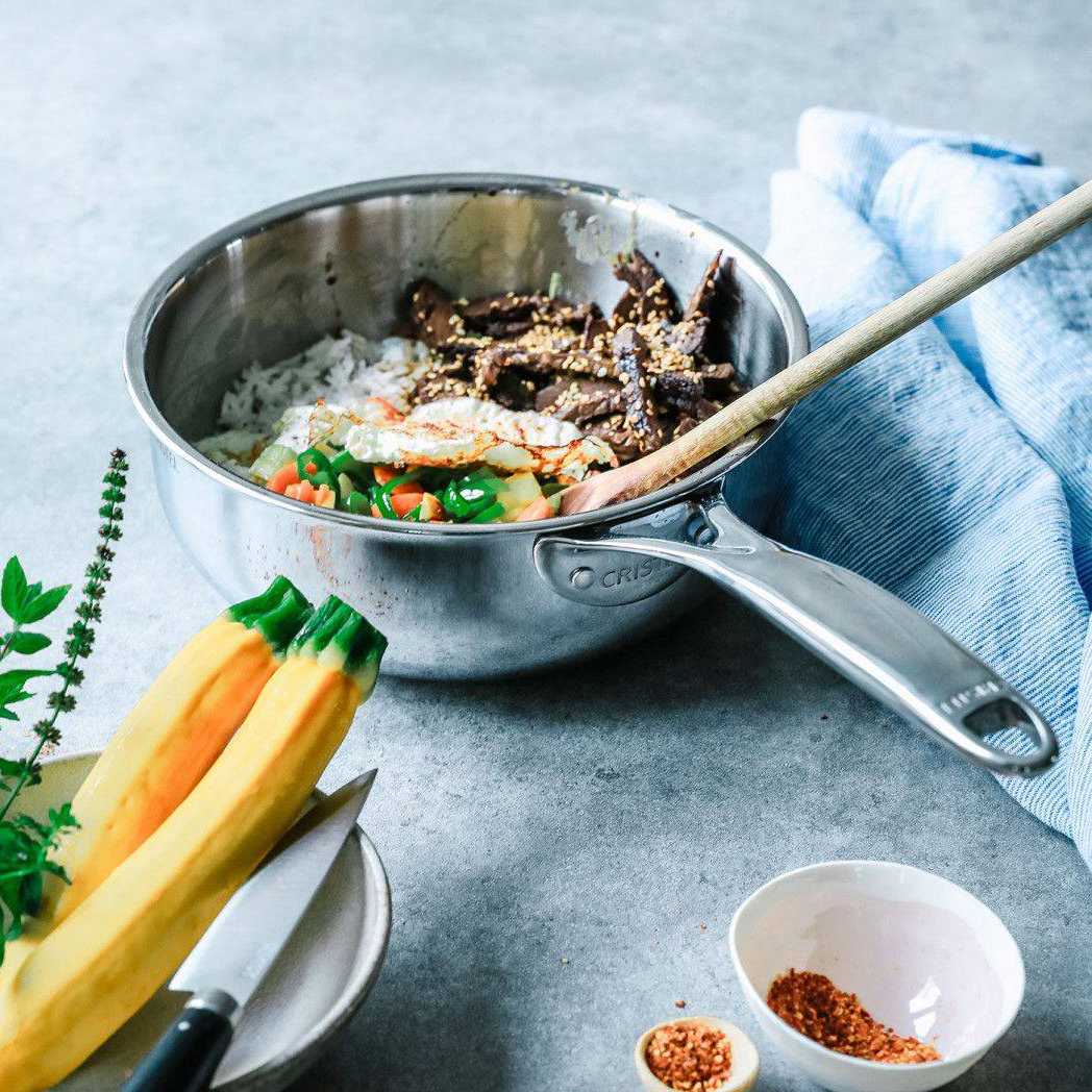 Castel Pro 18/10 stainless steel stewpan combines the best achievements of the Cristel company – five-layer sides and bottom, wide pouring side, riveted cast stainless steel handles.