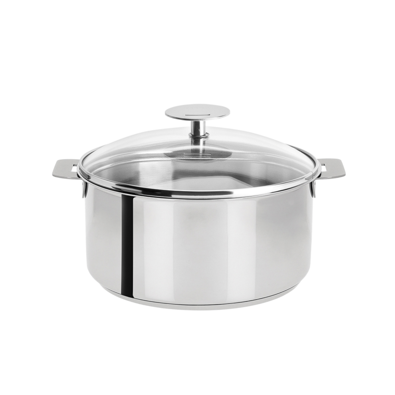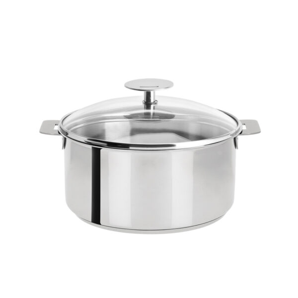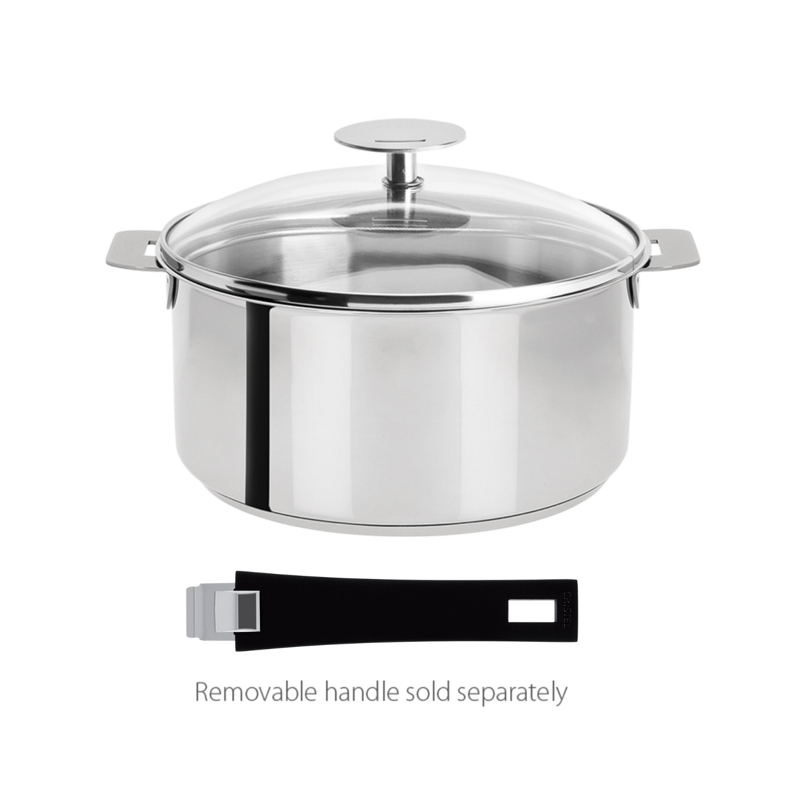 Saucepan Stainless steel 18/10 with domed glass lid, shiny finish, detachable handle, from Mutine collection. A must have in the kitchen, Mutine saucepans exist in 4 sizes: 1 qt, 1.5 qt, 2 qt and 3 qt. The detachable handle system allows a perfect stacking of Cristel cookware to save space in drawers, cabinets and in the dishwasher.