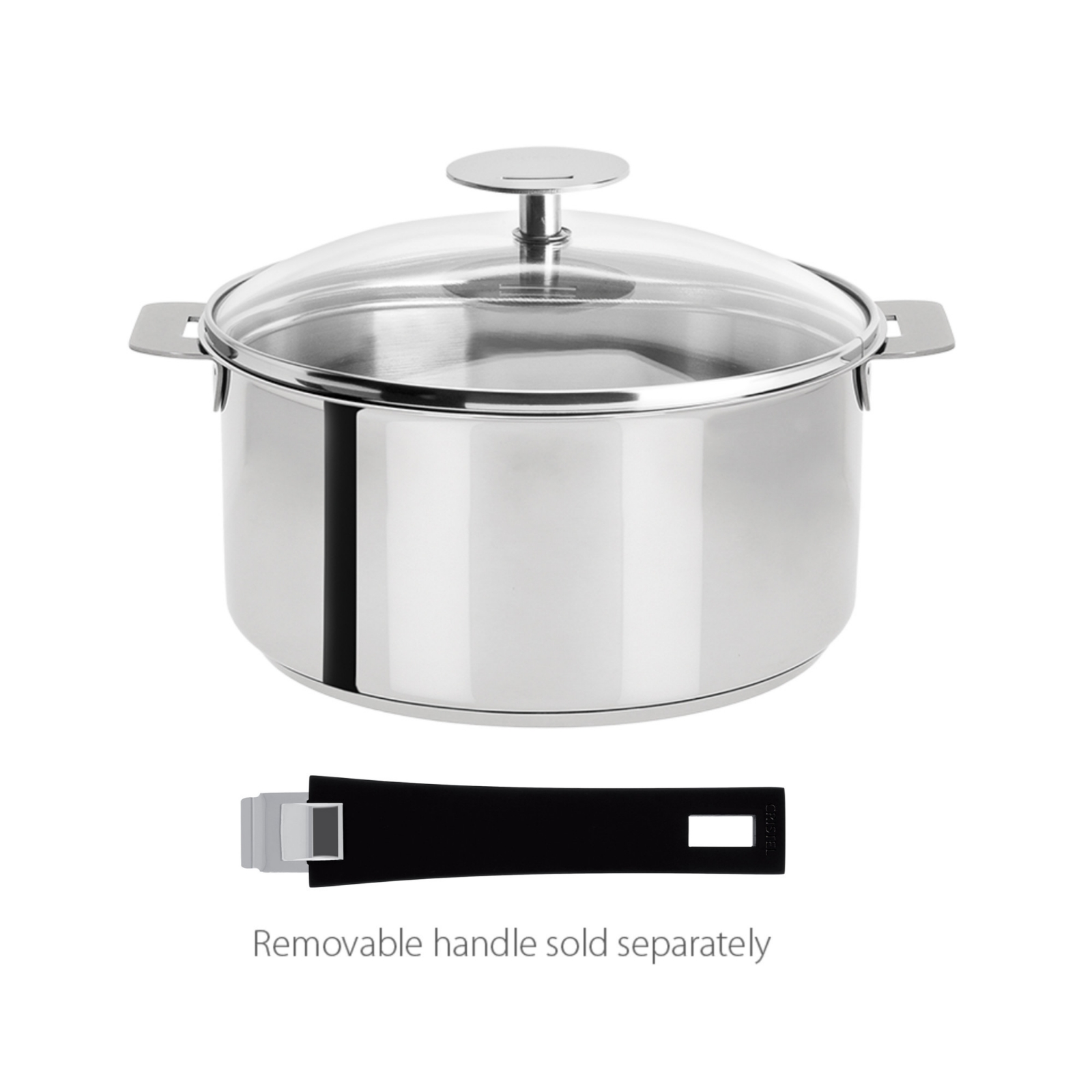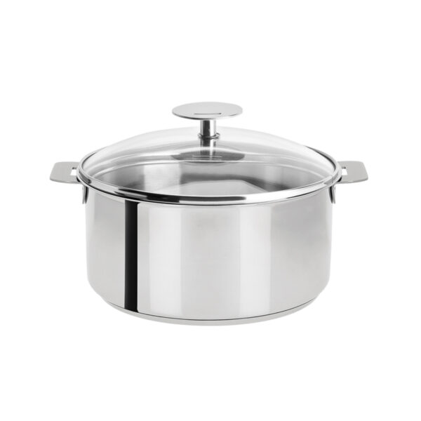Saucepan Stainless steel 18/10 with domed glass lid, shiny finish, detachable handle, from Mutine collection. A must have in the kitchen, Mutine saucepans exist in 4 sizes: 1 qt, 1.5 qt, 2 qt and 3 qt. The detachable handle system allows a perfect stacking of Cristel cookware to save space in drawers, cabinets and in the dishwasher.