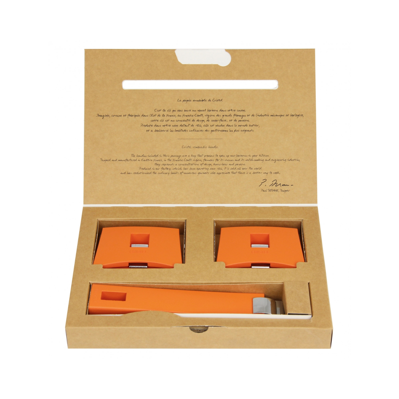 The latest in Cristel detachable handles, this set of Mutine handles 1 long Handle and 2 side handles combines stainless steel from the cooking utensils of the Mutine collection and bakelite. These handles are suitable for all pots, pans, … of the various Cristel detachable collections.