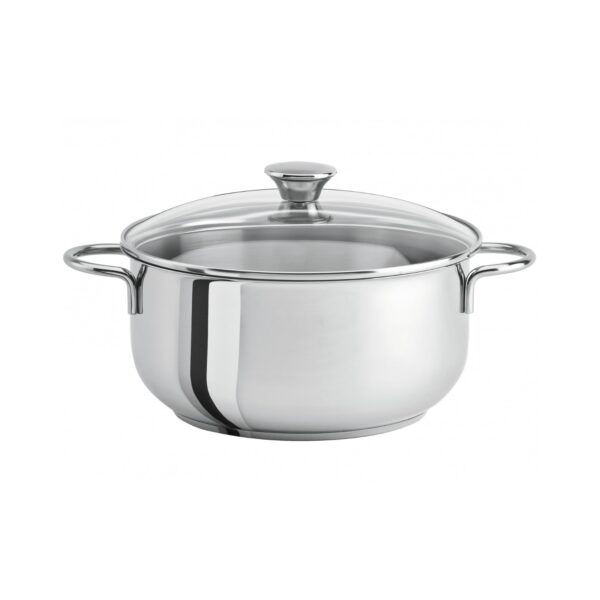 18/10 polished mirror finish stainless steel stewpan, cast stainless steel side handles.