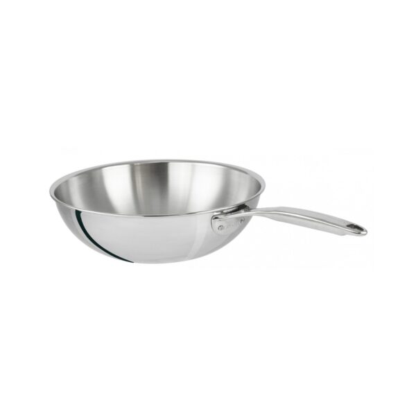Mirror finish stainless wok, made with triple-layer Multiply stainless steel / aluminium / stainless steel.