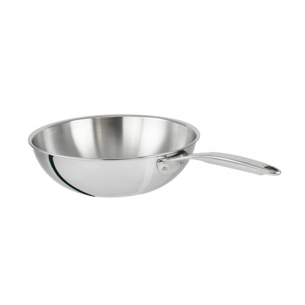 Mirror finish stainless wok, made with triple-layer Multiply stainless steel / aluminium / stainless steel.