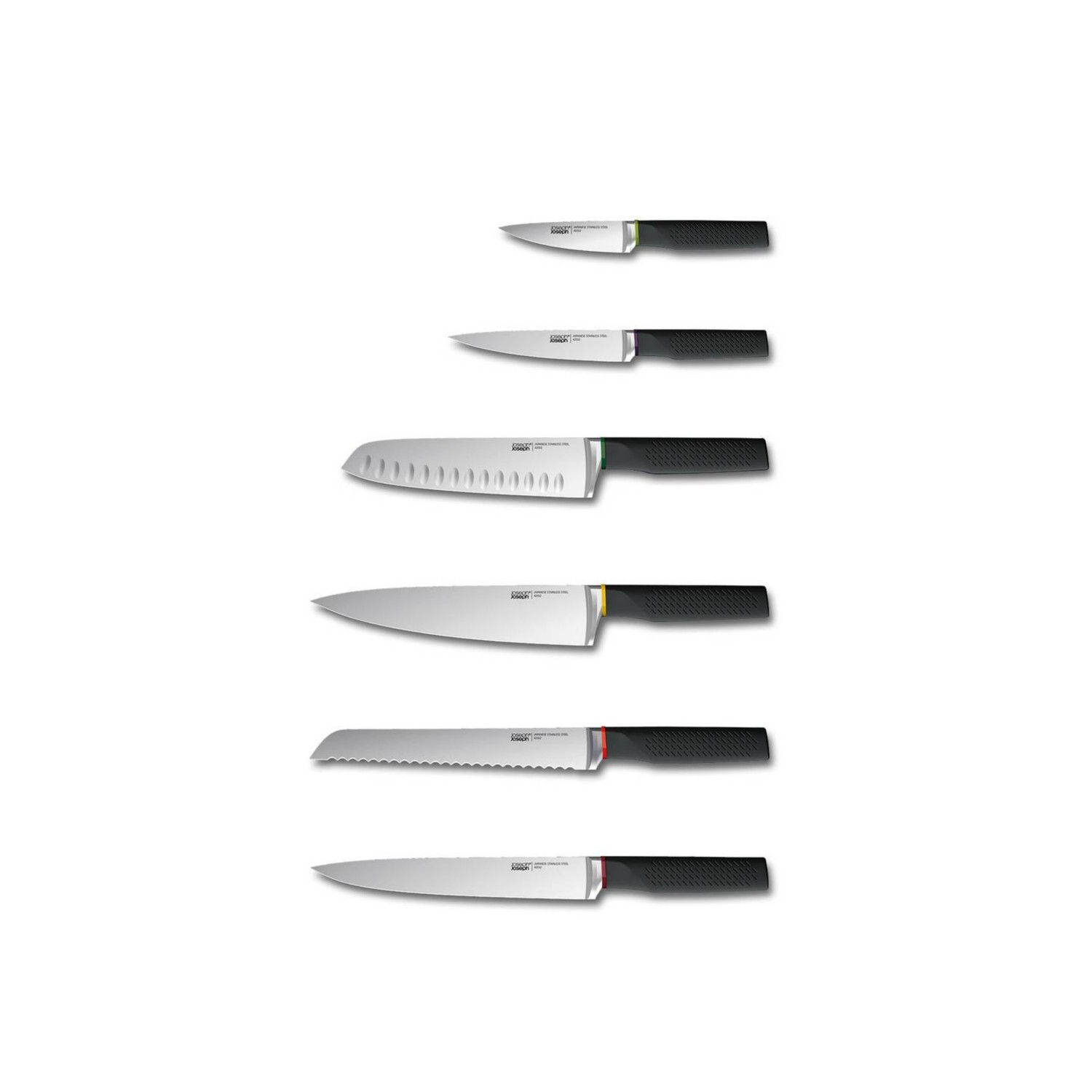 – Set includes: paring knife, serrated knife, santoku knife, chefs knife, bread knife and carving knife