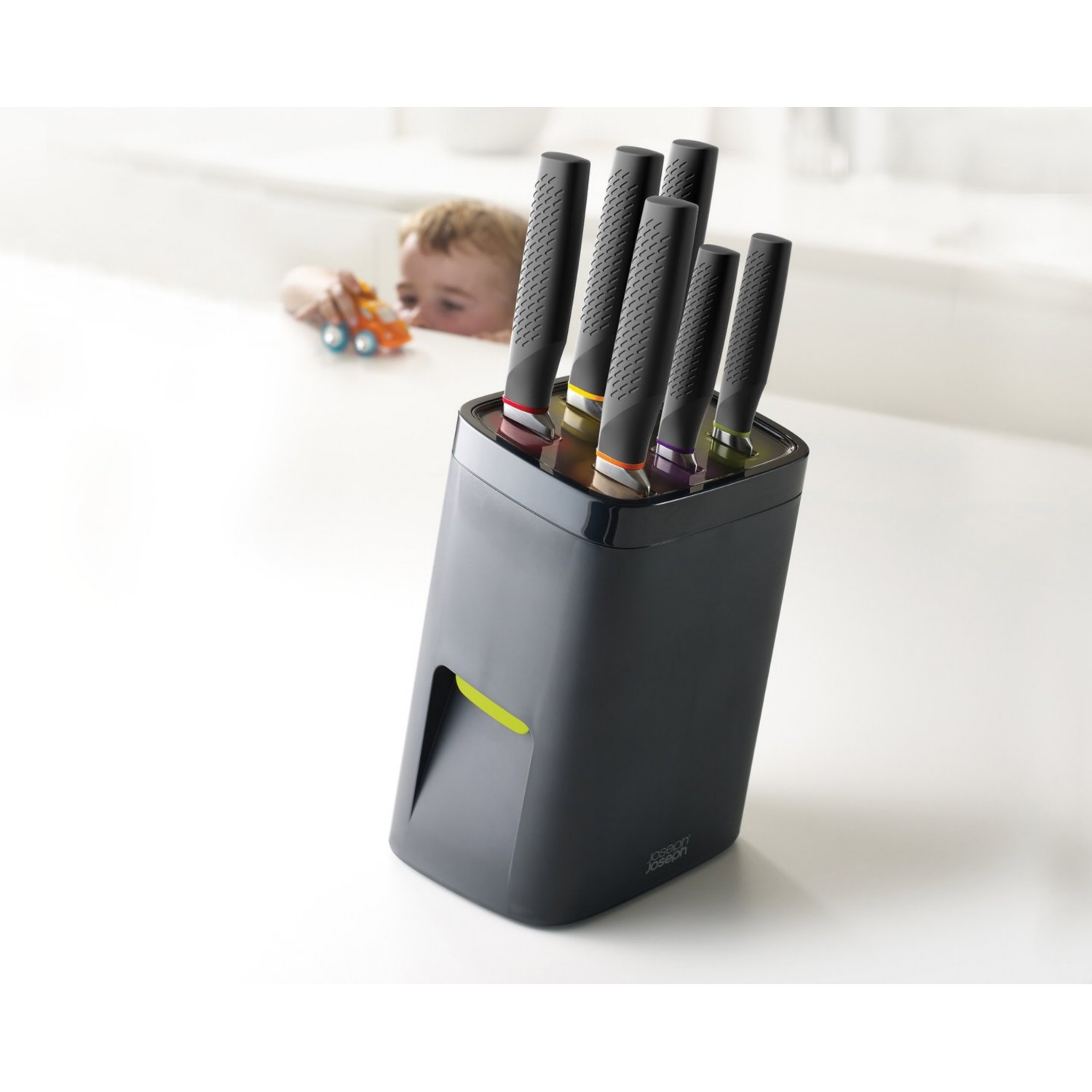 This knife block locks the knives safely inside the block so only an adult-sized hand can remove them.