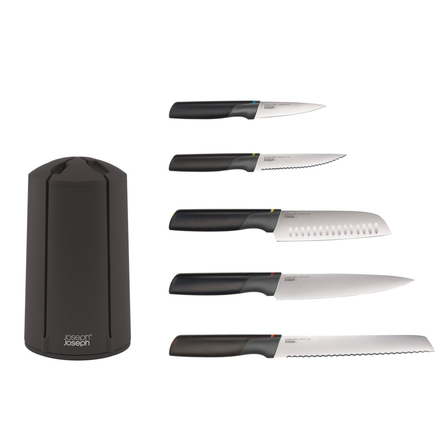 – Set includes: 3½” paring knife, 4½” serrated knife, 5½” santoku knife, 6½” chef’s knife, 8” bread knife and rotating knife block.