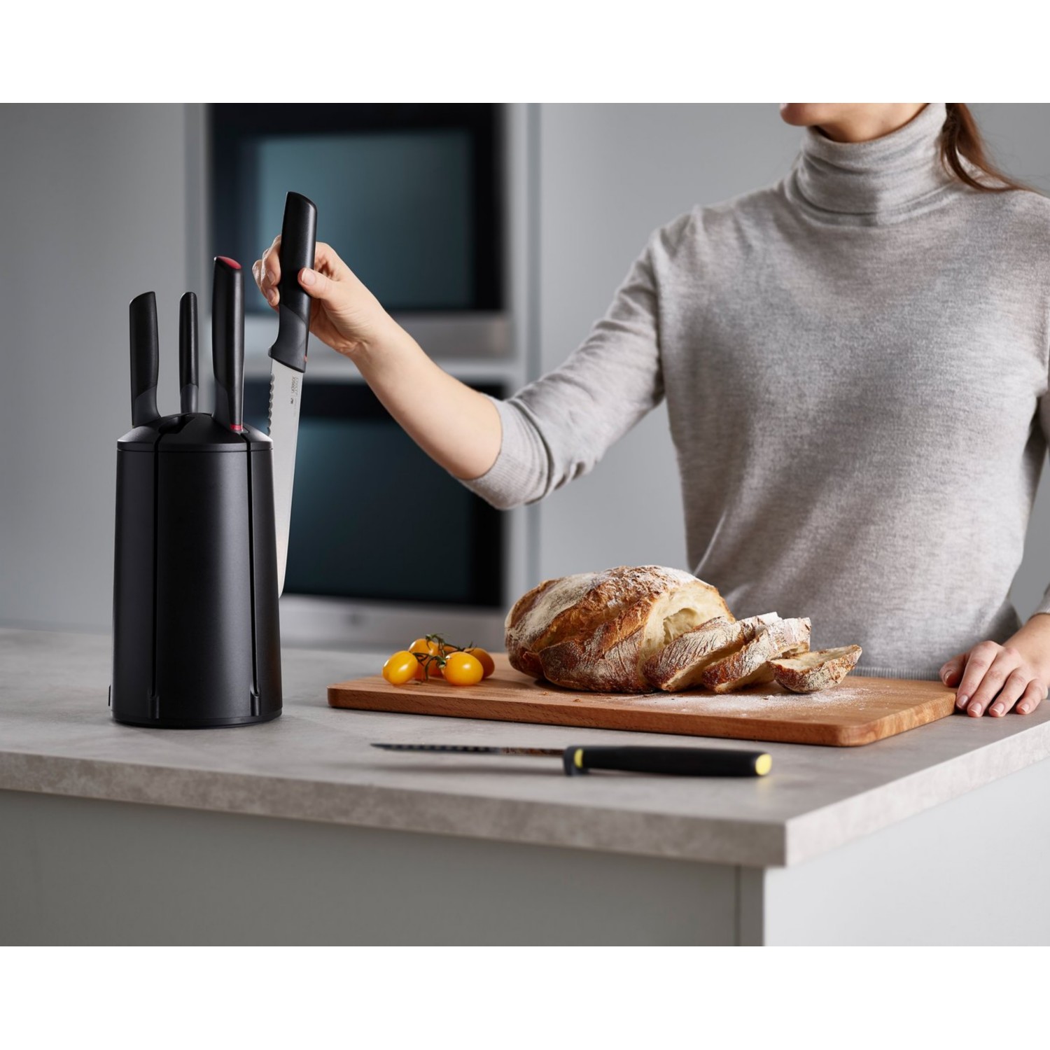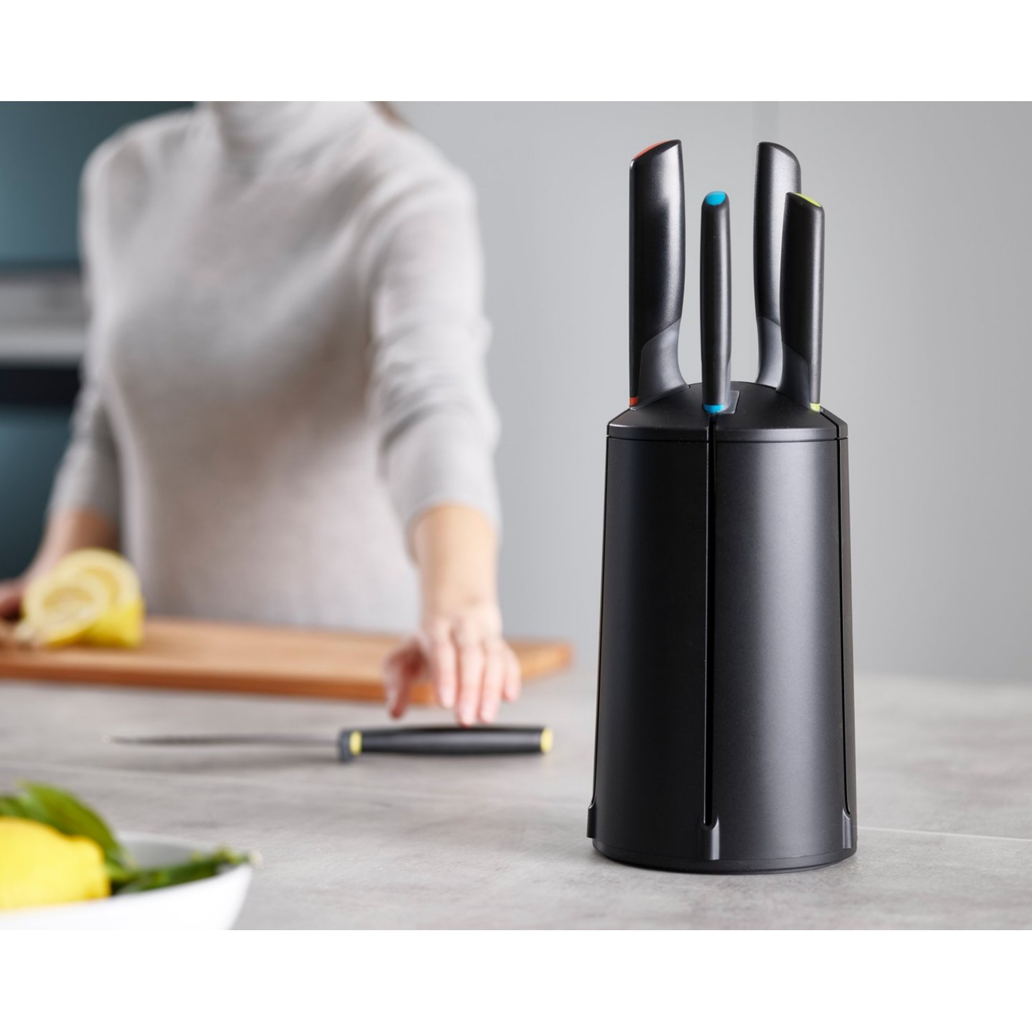 – Rotating knife block features vertical slots for easy access and has a non-slip base