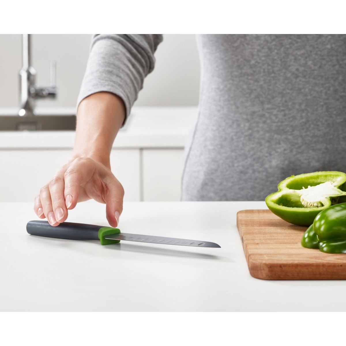 – Set includes: 3½ paring knife, 4½ serrated knife, 5 santoku knife and 6 chefs knife.