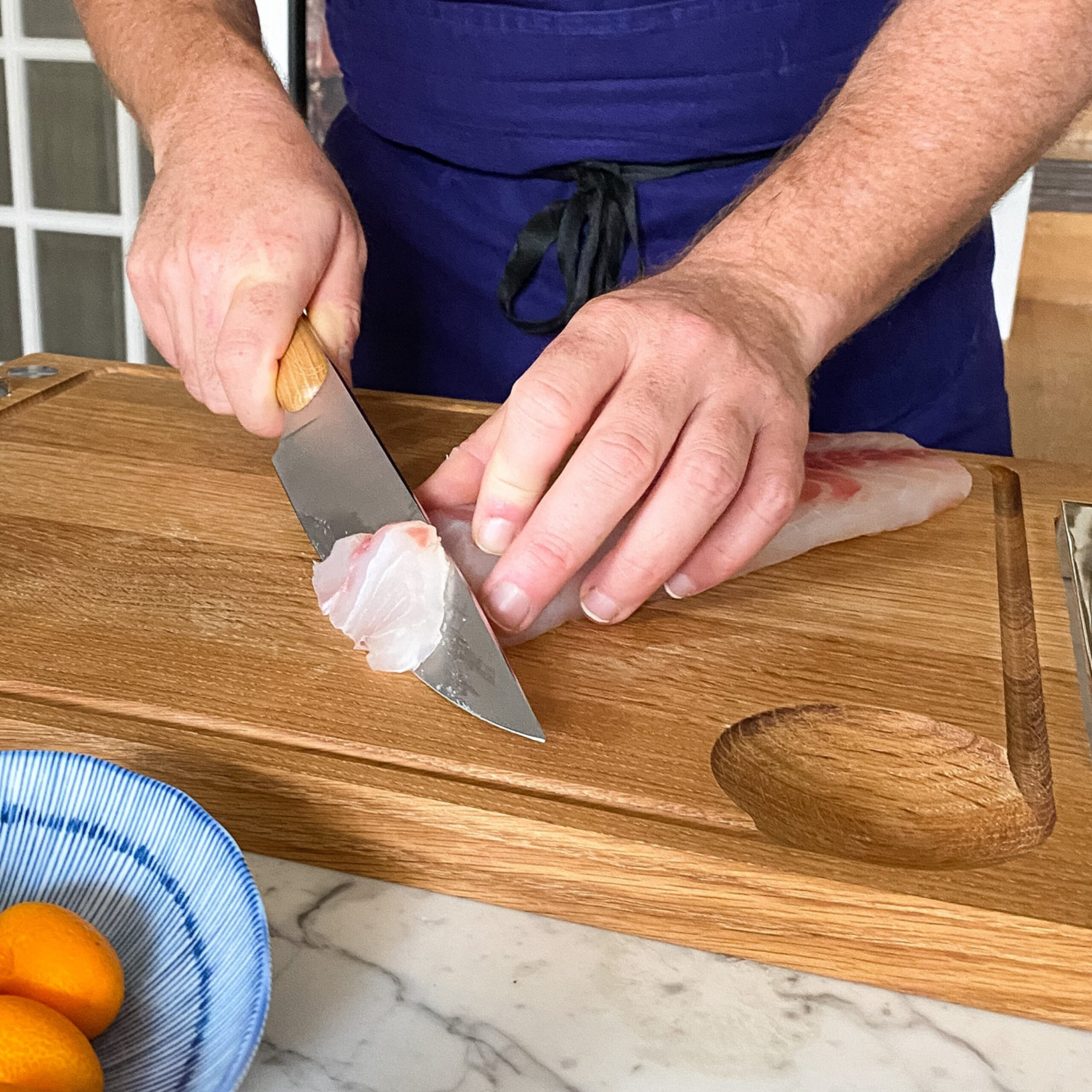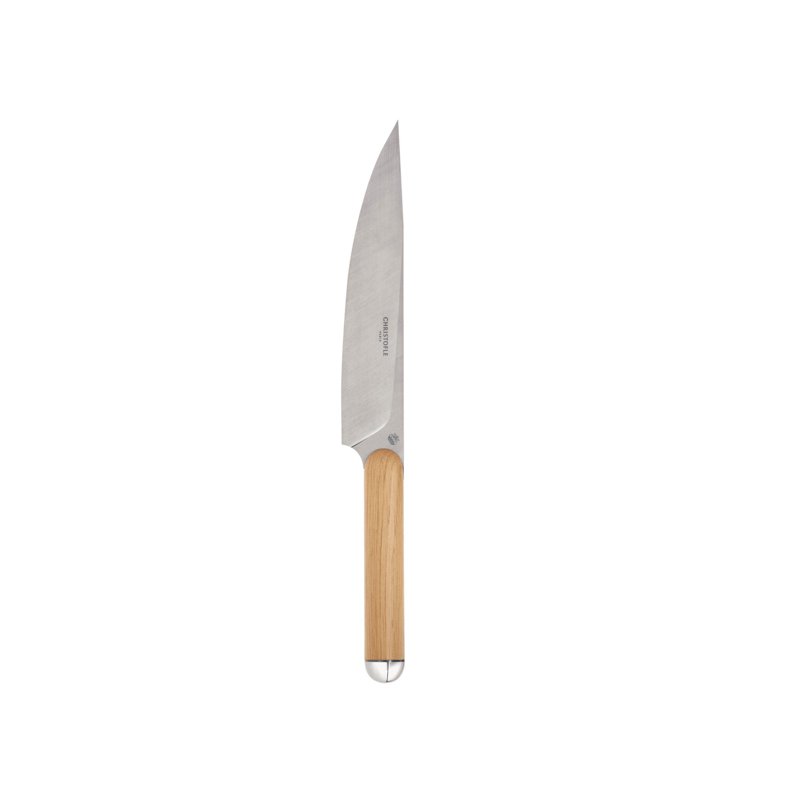The chef knife is the multitasking kitchen knife. It is easily identifiable by its long blade, perfectly equilibrated that enables him to chop and cut any kind of food.The solid oak handle crafted in an authentic raw style evokes the tradition of solidity dear to Christofle.