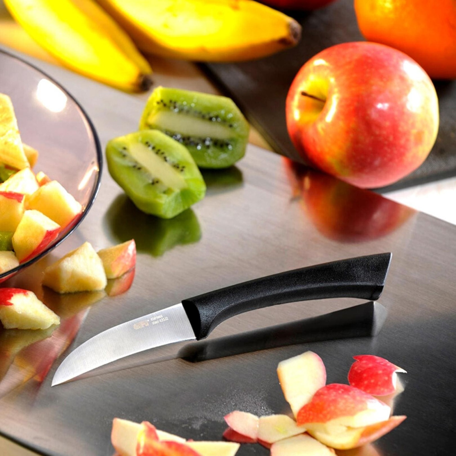 Good design and long-lasting sharpness are the strong points of the SENSO peeling knife. Thanks to its 8 cm blade it is perfect for peeling potatoes and fruit. Peeling is child’s play thanks to the special curved shape. The ergonomic black plastic handle is designed to lie in the hand firmly, and the underside is rubber-coated for a safe grip even with wet hands.