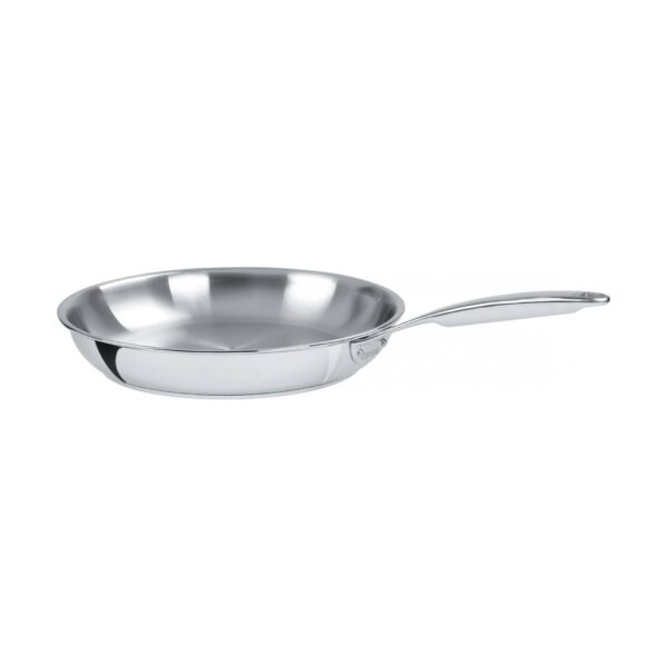 Stainless steel frying pan with a glossy mirror finish Ultraply 5. Consists of 5 layers: stainless steel / aluminum / stainless steel / aluminum / stainless steel on the bottom.