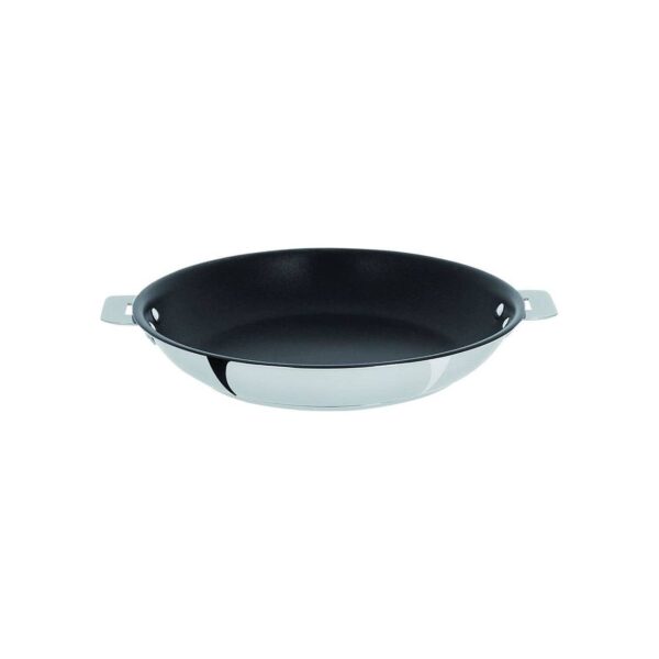 Mirror finish stainless frying pan made of triple-layer Multiply stainless-aluminium-stainless with an Exceliss non-stick coating.
