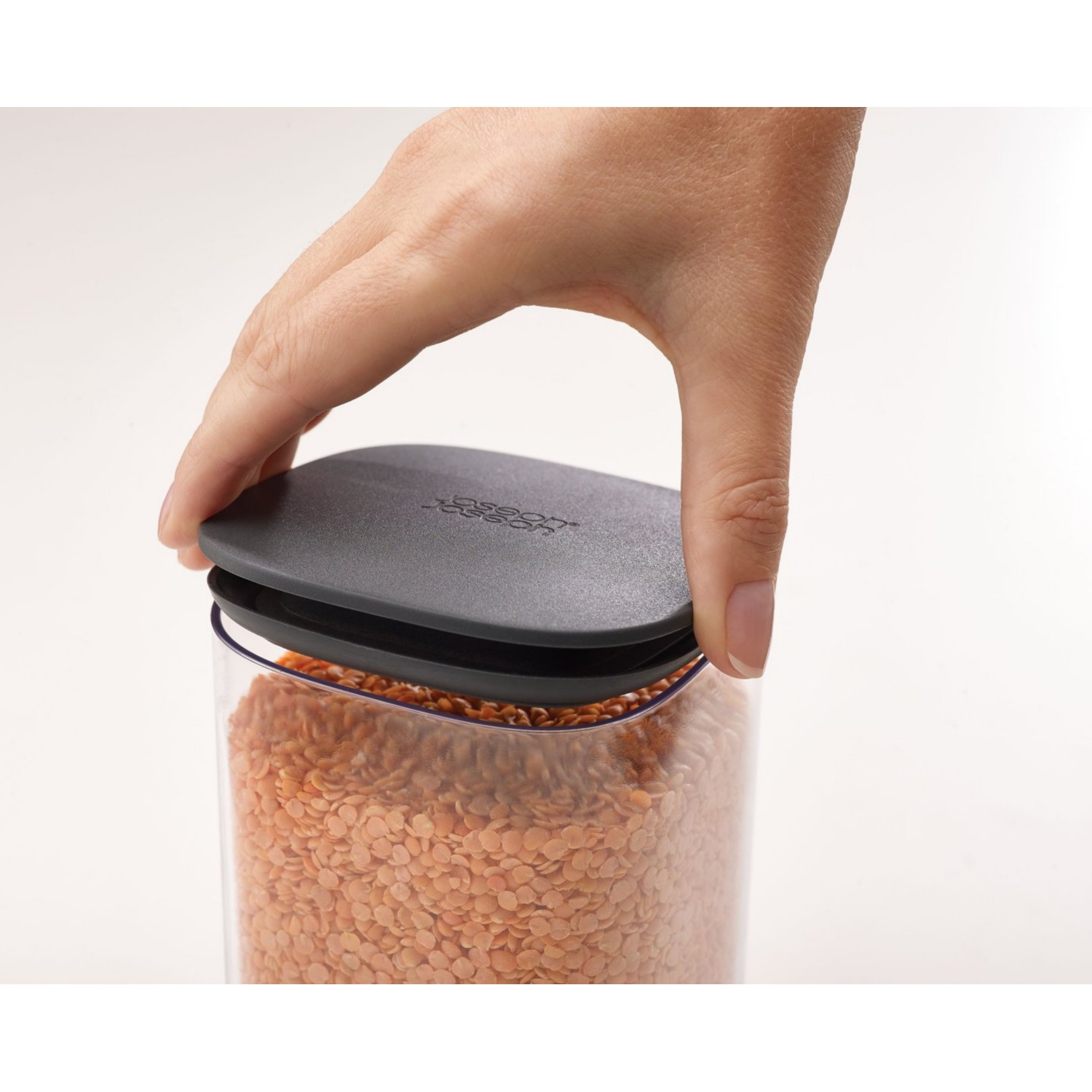 This smart storage container set features a clever stand that allows easy access to any jar, regardless of its position.