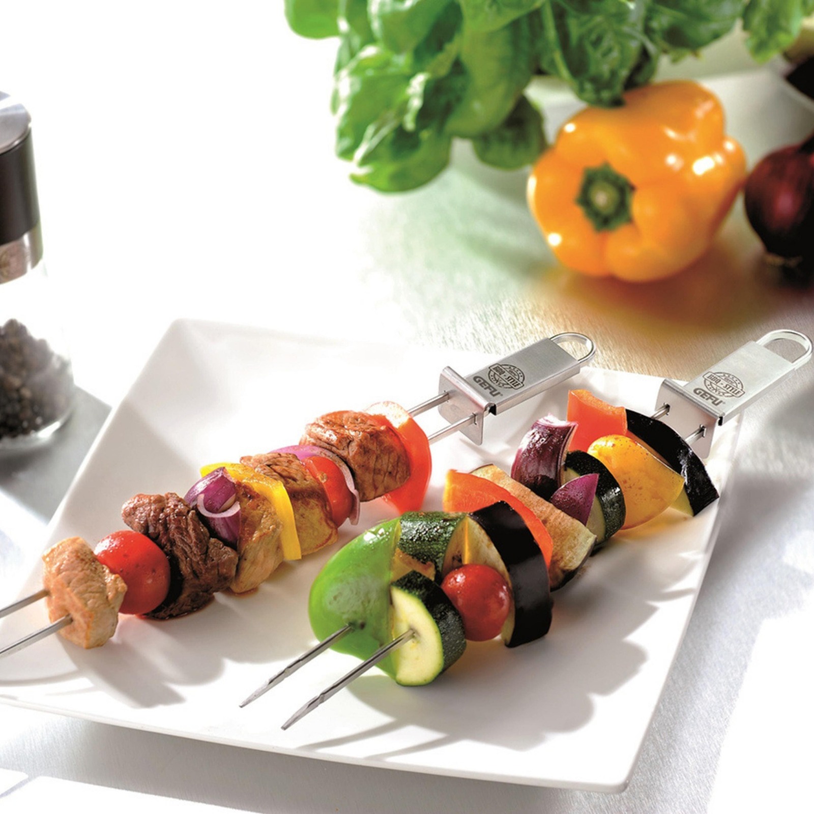 These barbecue skewers are perfectly suited for meat, fi sh, vegetables and seafood. Just fi ll the double skewers just as you like and place them on the barbecue or in the pan. Thanks to the angular form the pieces remain in place without slipping. The integrated slider makes the food easy to remove, guaranteeing a full plate and a clean table.