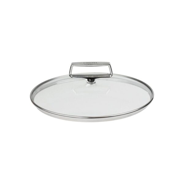 The heat-resistant glass lid matches perfectly with the cookware of its own diameter. Has a stainless steel rim and handle.