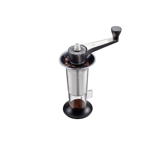 The coffee grinder Lorenzo guarantees freshly ground coffee at the flick of a wrist. Its scale provides 11 degrees of fineness, allowing you to grind your coffee to perfectly suit your taste: powdery for espresso, semi-powdery for filter coffee or coarse for the French press. Extra-large and with no effect on taste, the grinding gear requires markedly less turning than conventional mills. Moreover, it can easily be re-adjusted to always produce exactly the same result at the individual settings. The detachable crank can be attached vertically to the holder on the side of the coffee container. In this way the coffee grinder, which is equipped with an aroma lid, takes up but little space.