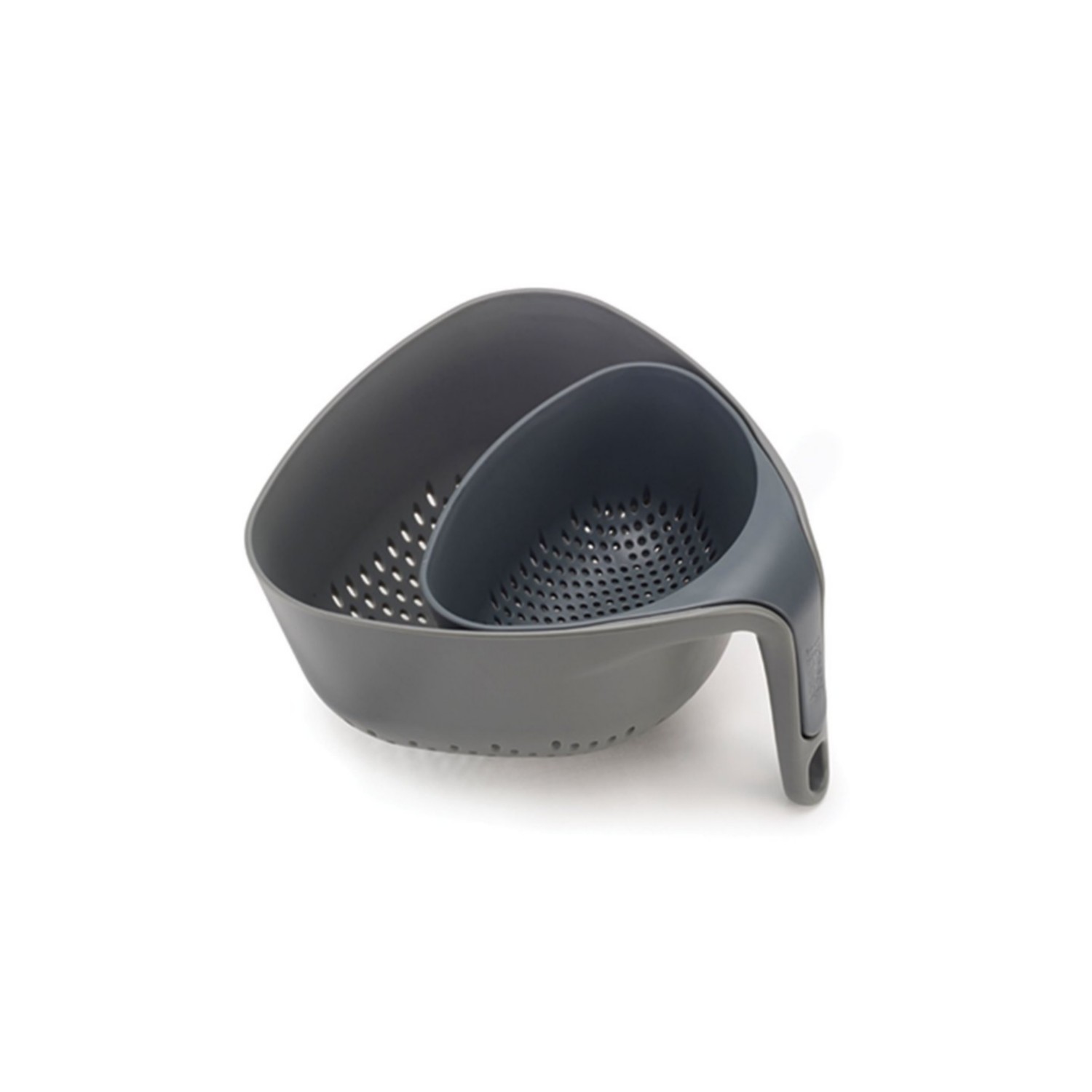 This set of two colanders feature clever vertical handles that leave one hand free for operating the tap and ensure they remain upright and stable if placed in a sink.