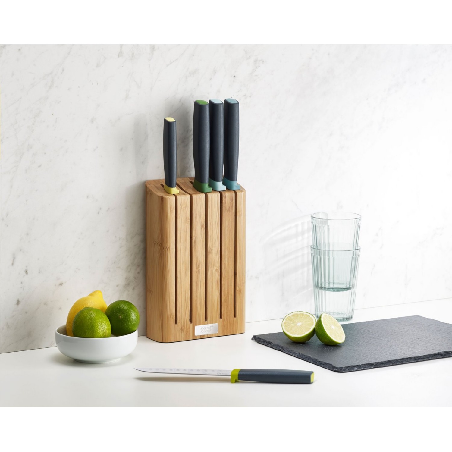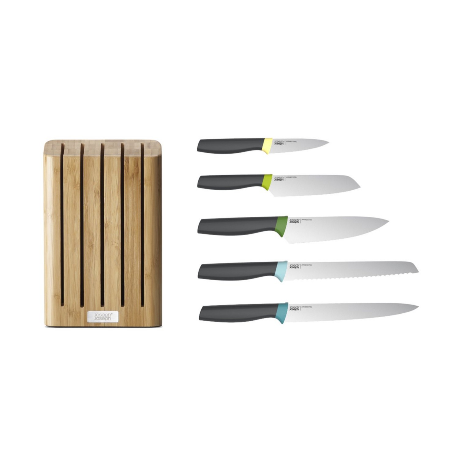 This set contains 5 essential kitchen knives with a slimline bamboo block to store them in that takes up less room on your worktop than conventional knife blocks.