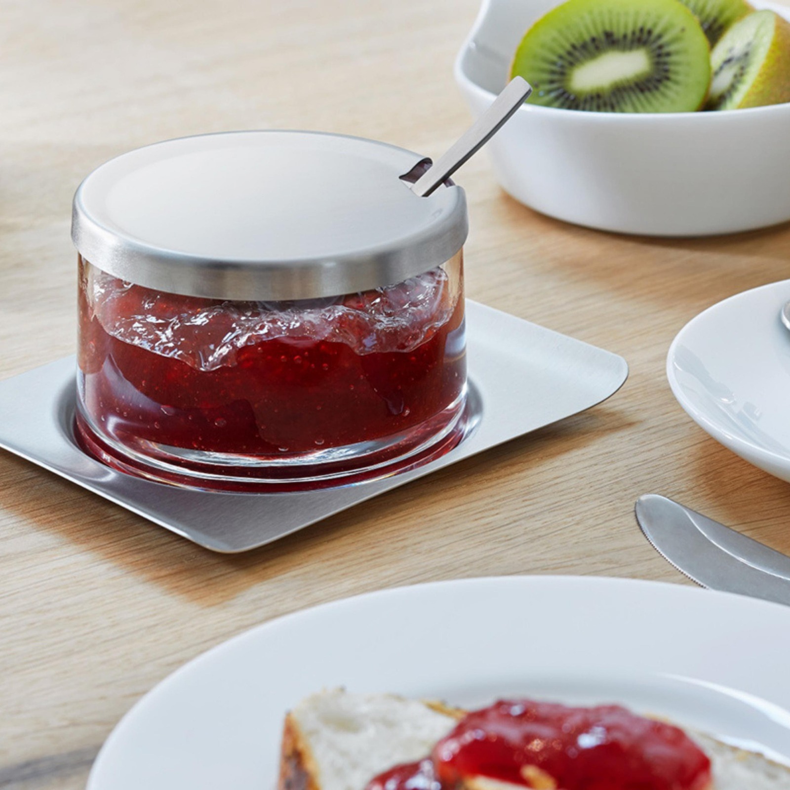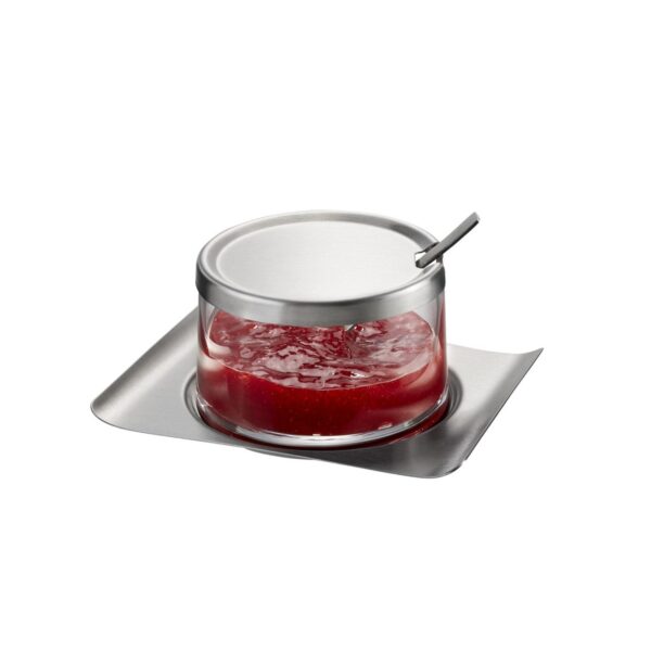 The elegantly curved stainless steel saucer provides an elegant base for the hand-made jam jar. Marmalade or olives, freshly grated Parmesan or a spicy dip: anything can be served in perfect style.