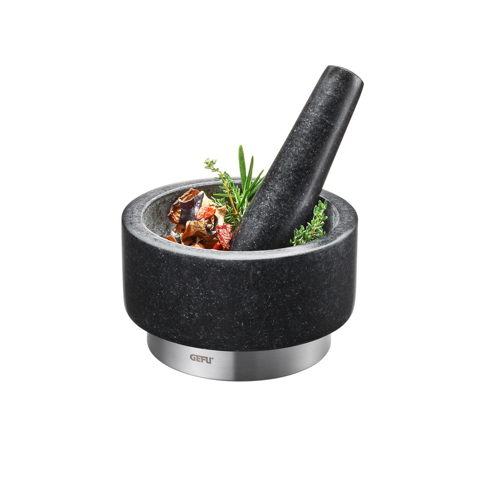 Heavy granite with an elegant stainless steel ring. This beautiful mortar is perfect for making pesto, your own herbal creations, great spice blends and much more.