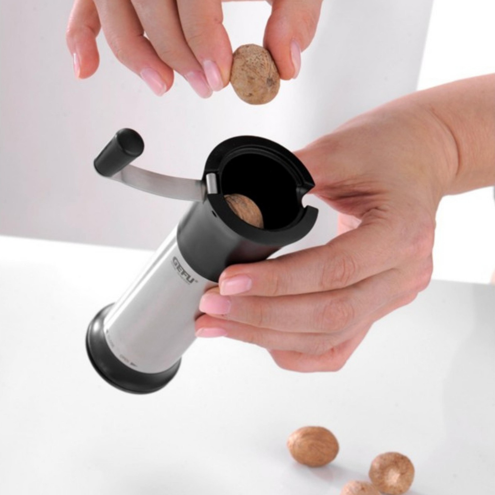 The nutmeg mill equipped with a LASER CUT grinding mechanism grinds nutmegs, tonka beans or hazelnuts completely.